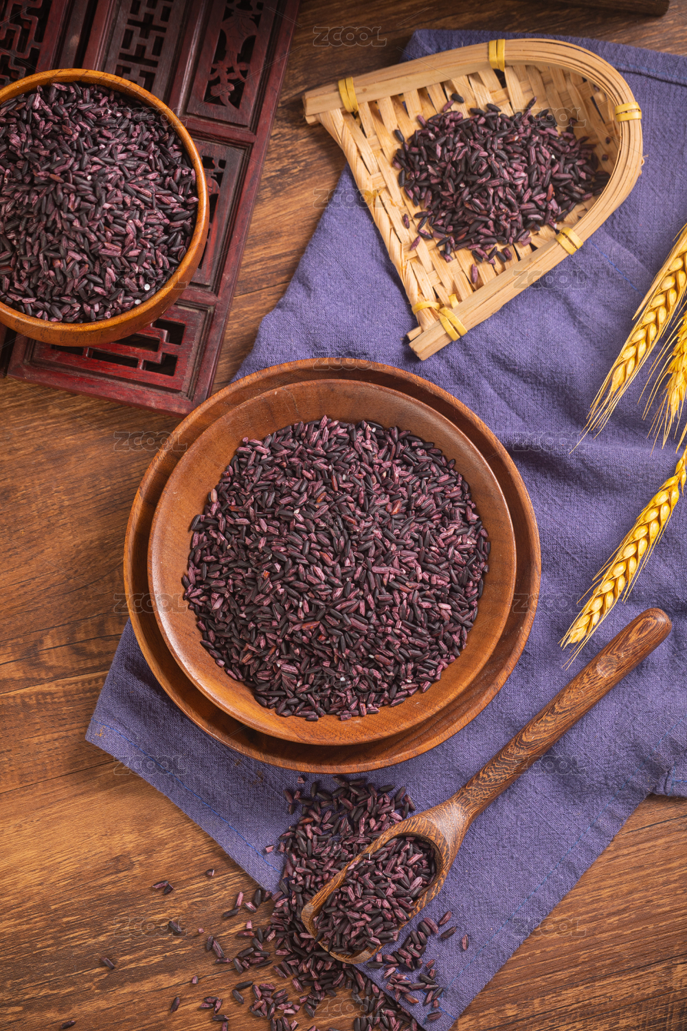 中式场景中桌子上装在木盘中的紫米俯拍