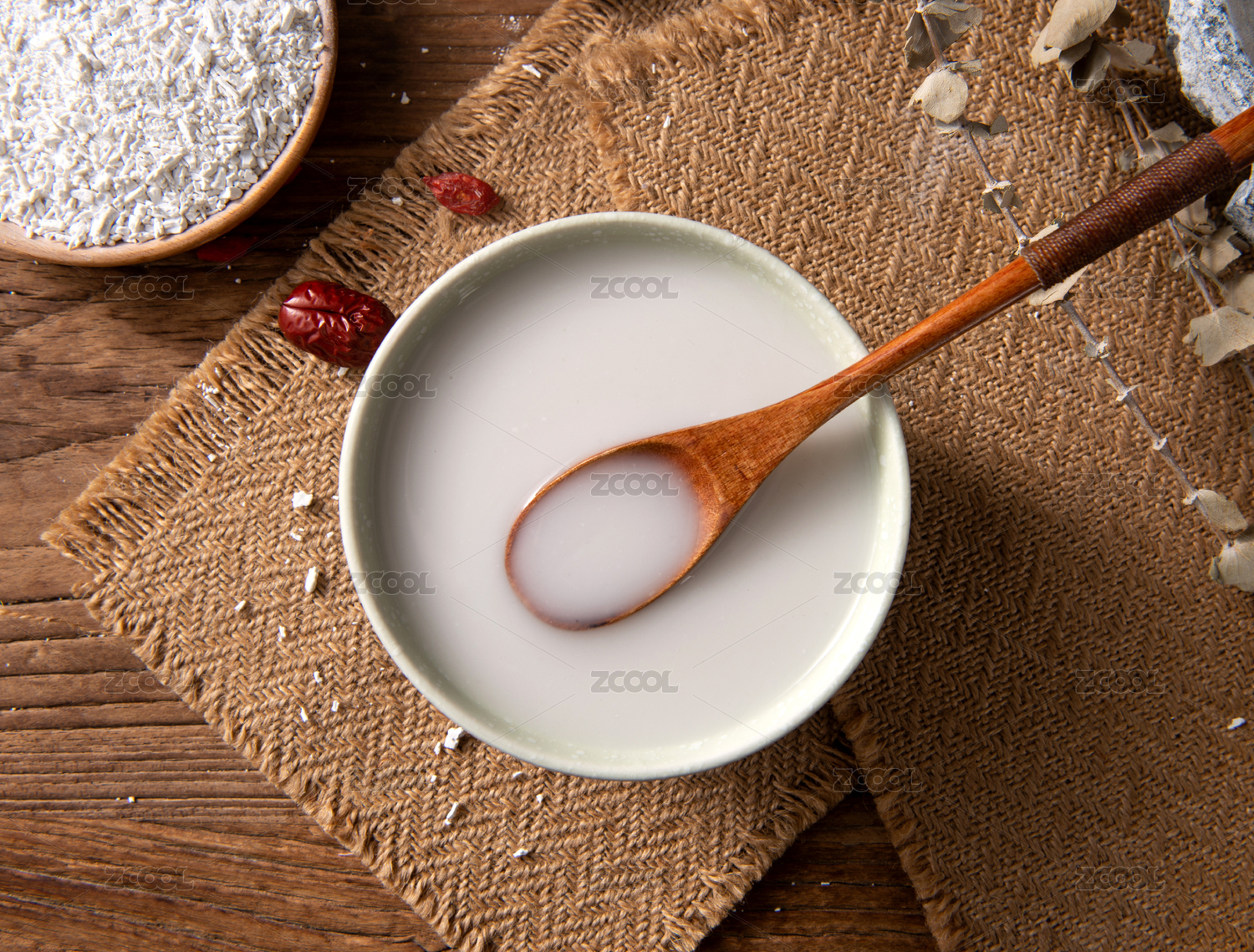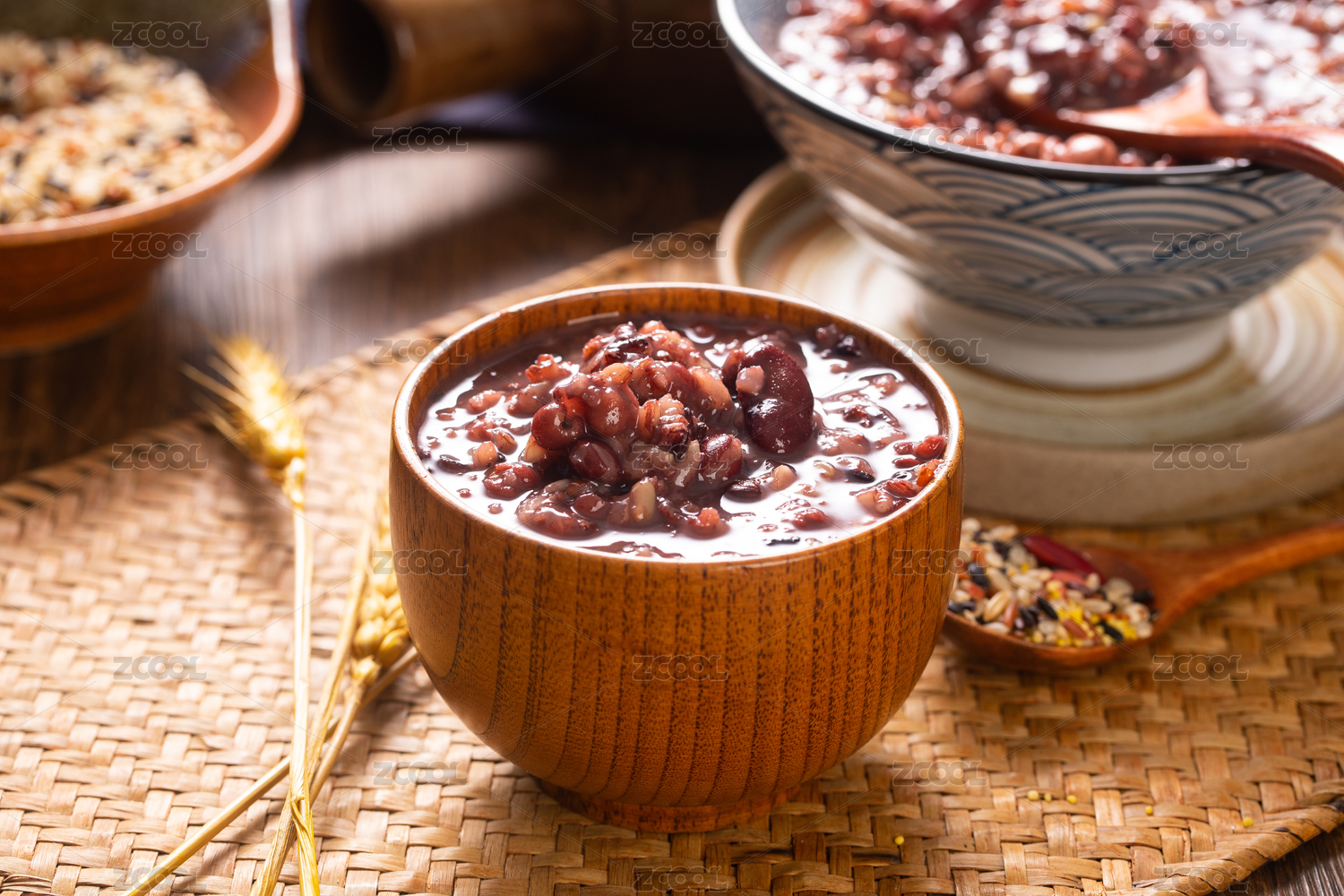 传统中式场景中的装在木碗中的五谷八宝粥