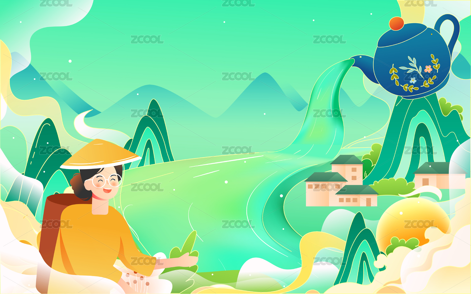 采茶人和自然风景矢量插画