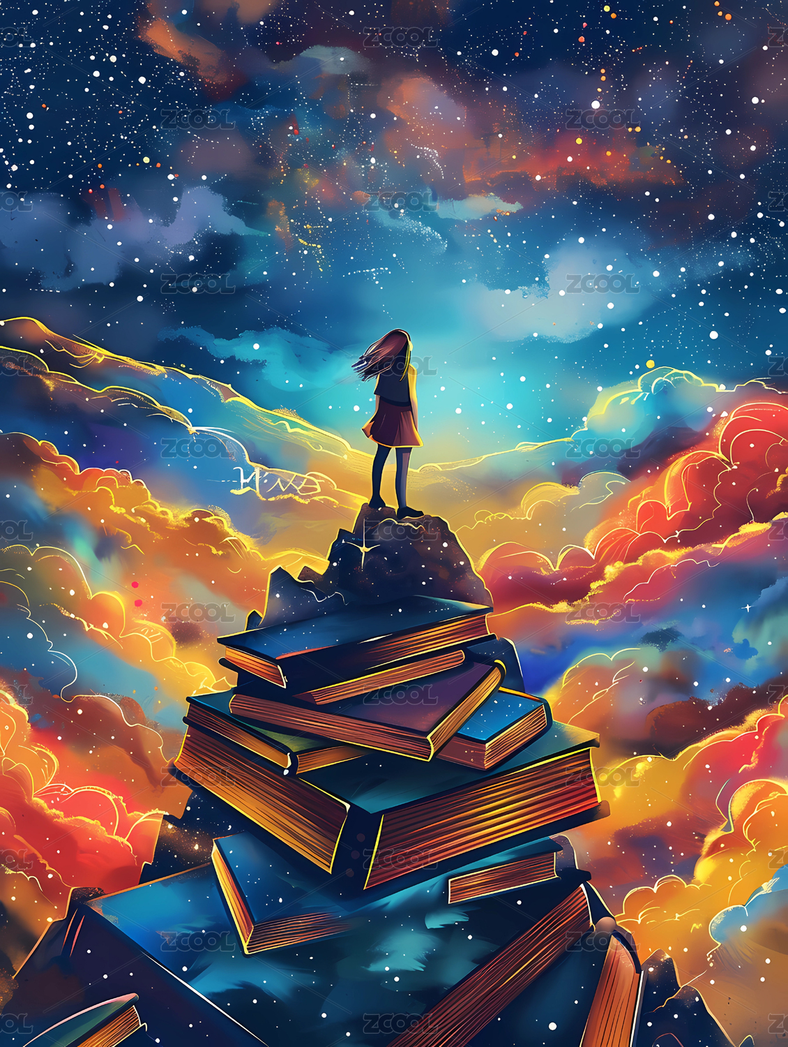 夜晚在书搭成的知识山脉里攀登徒步旅行