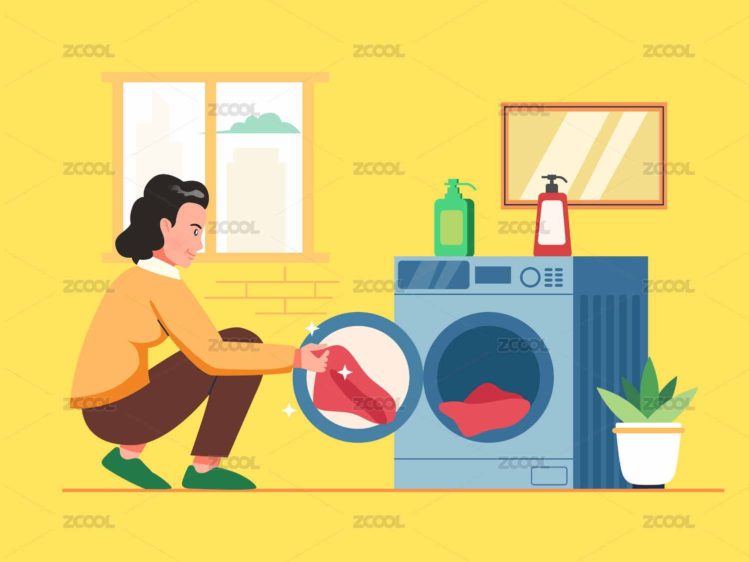 母亲手拿衣服放进洗衣机矢量插画
