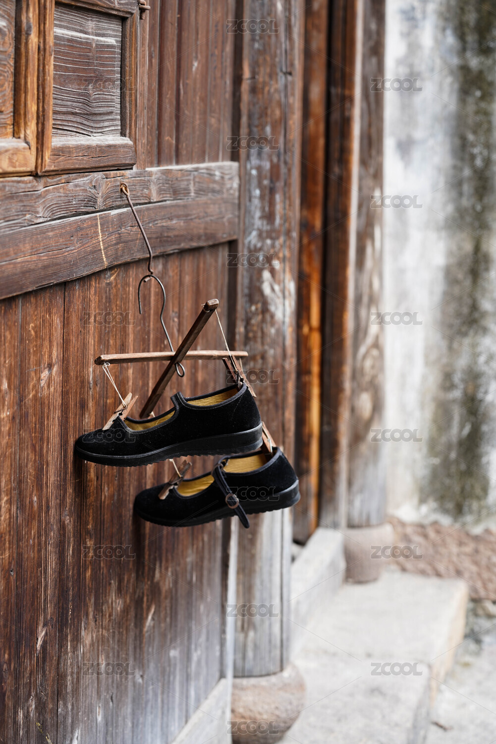 一双夹在竹衣架上的布鞋
