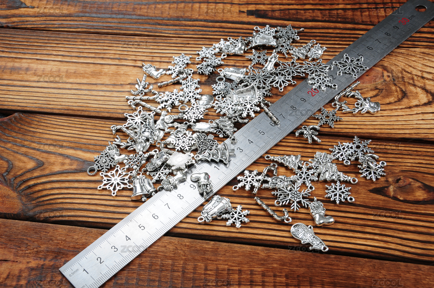 碳化木板上的DIY藏银饰品吊坠配件和钢尺