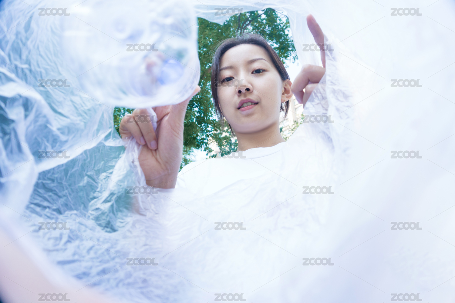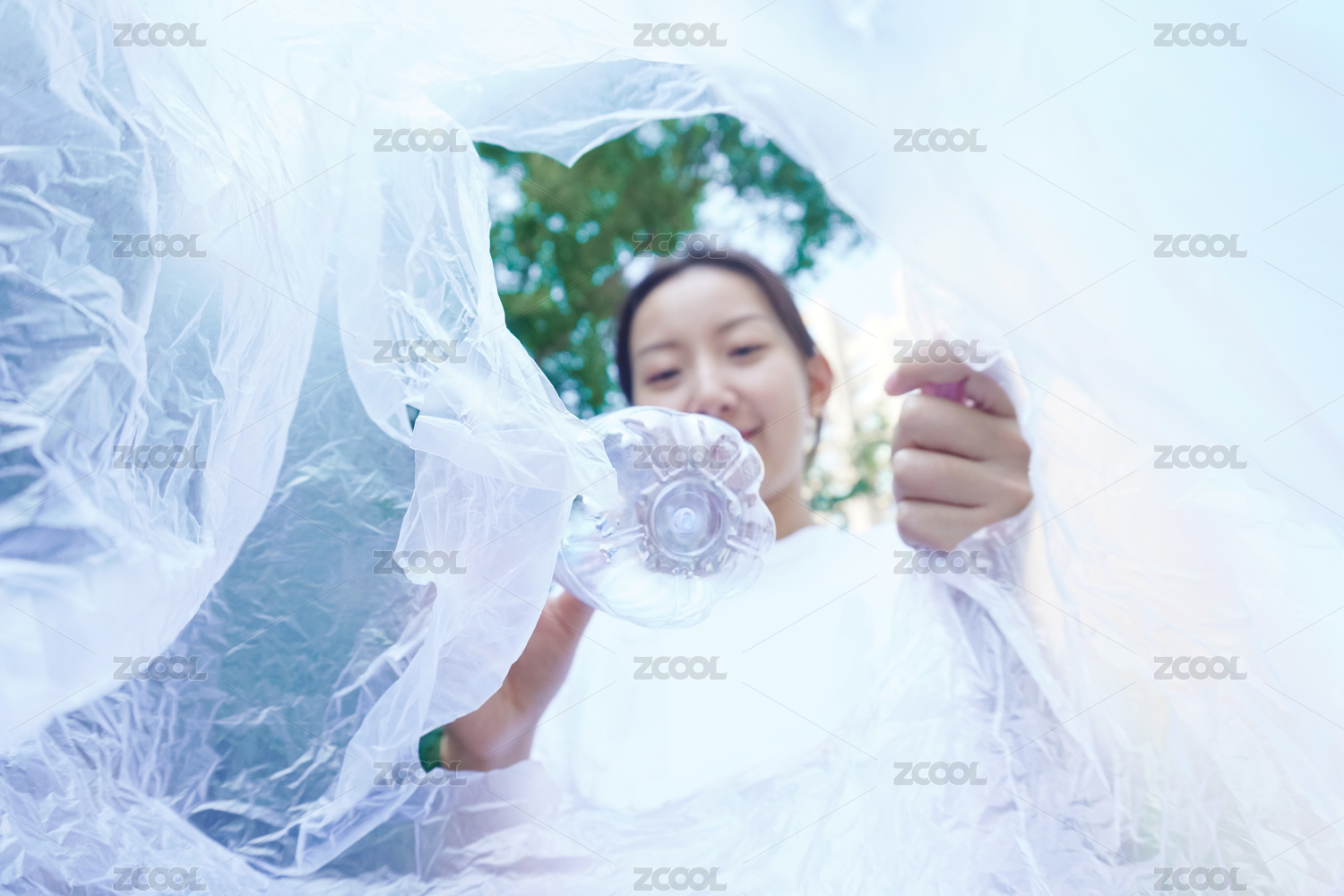 一位美丽的亚裔女人把塑料瓶丢进塑料袋里进行垃圾回收 俯视角