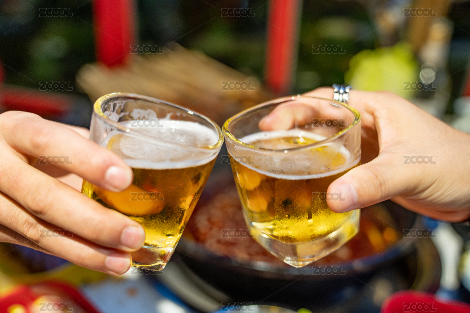 手拿装有啤酒的酒杯放在鸳鸯火锅上方准备碰杯