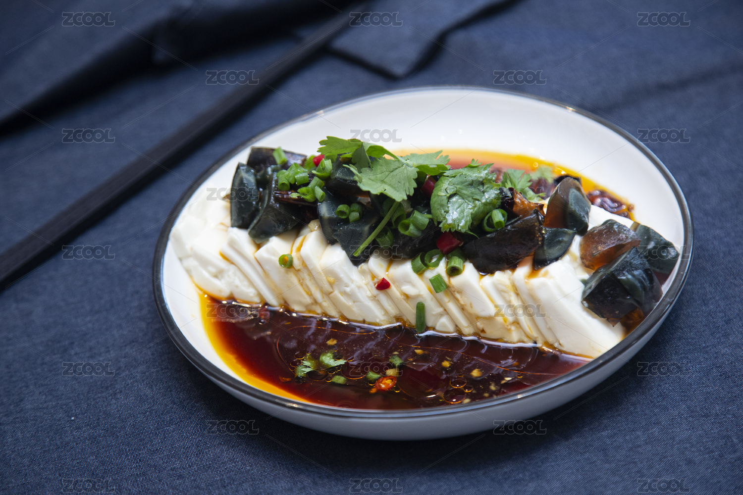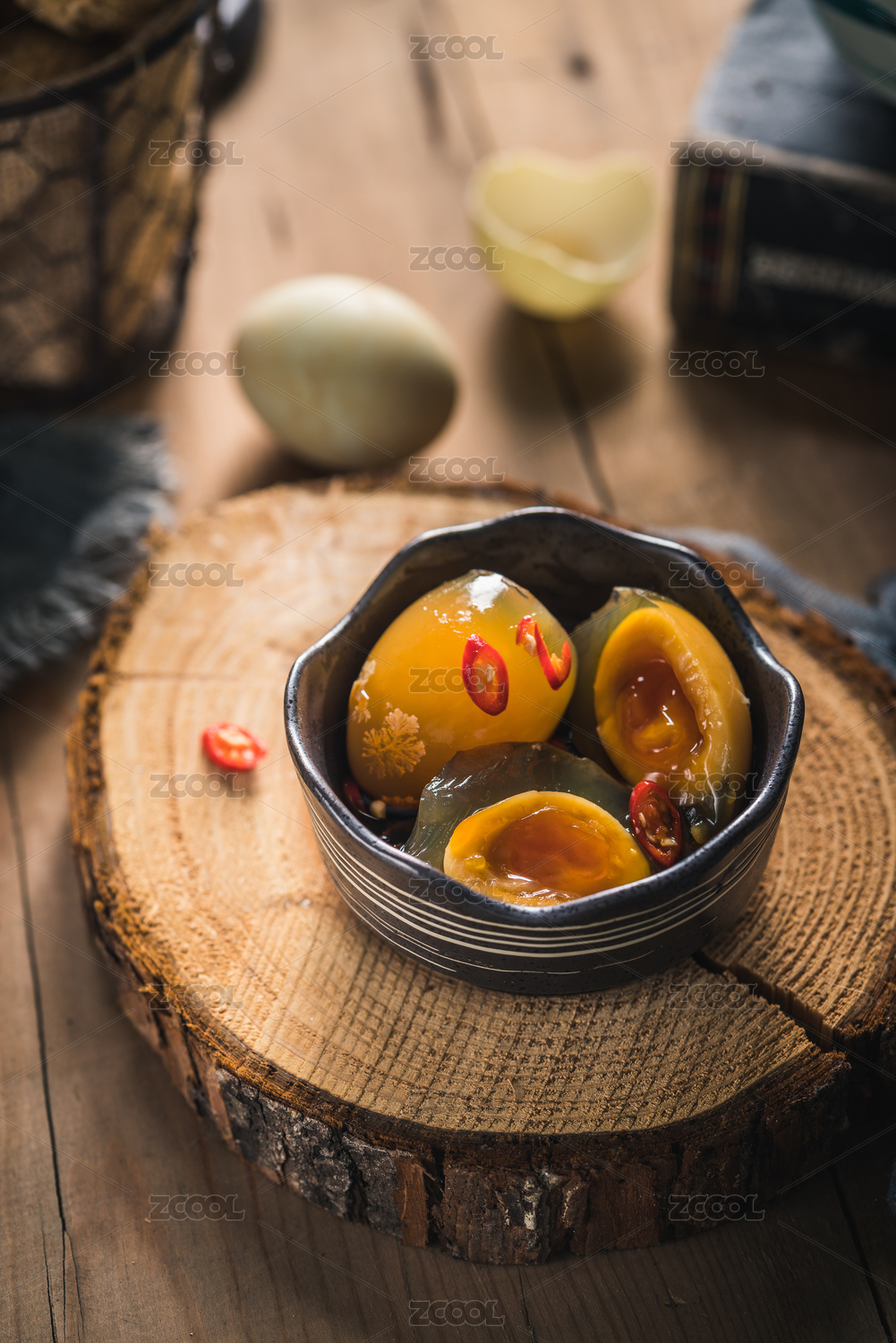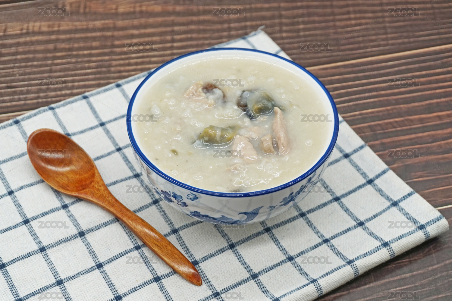木桌背景中的广东传统粥品皮蛋瘦肉粥