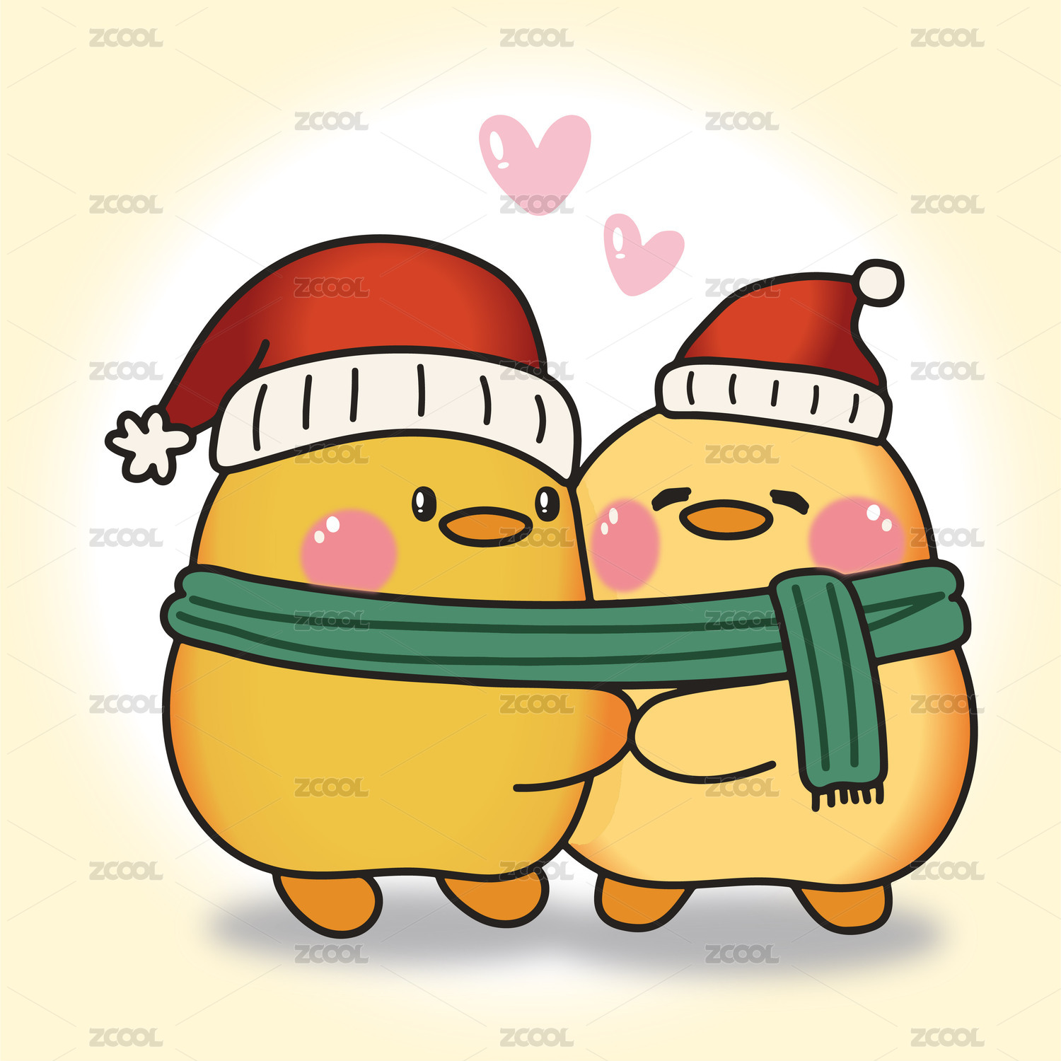 可爱卡通线条风格圣诞l两只小鸭子互相依偎