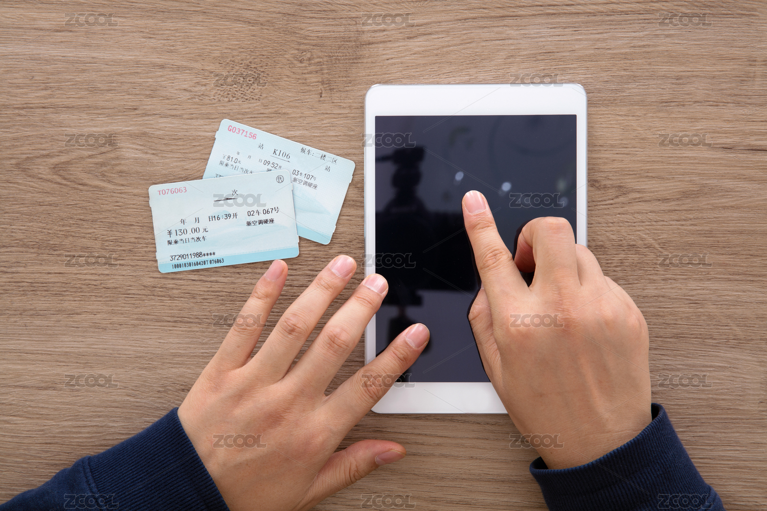 用手在操作平板电脑及抢到的回家的火车票