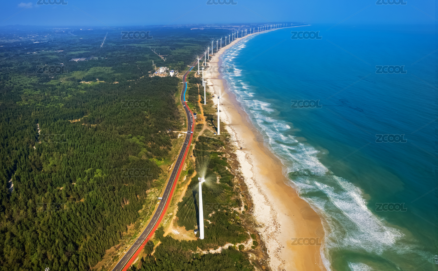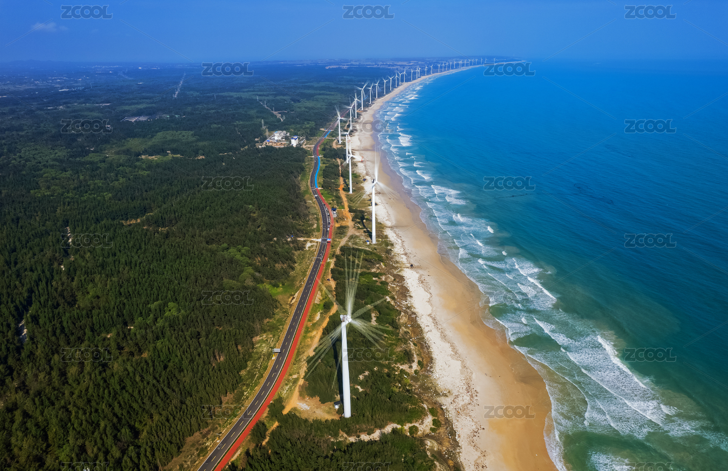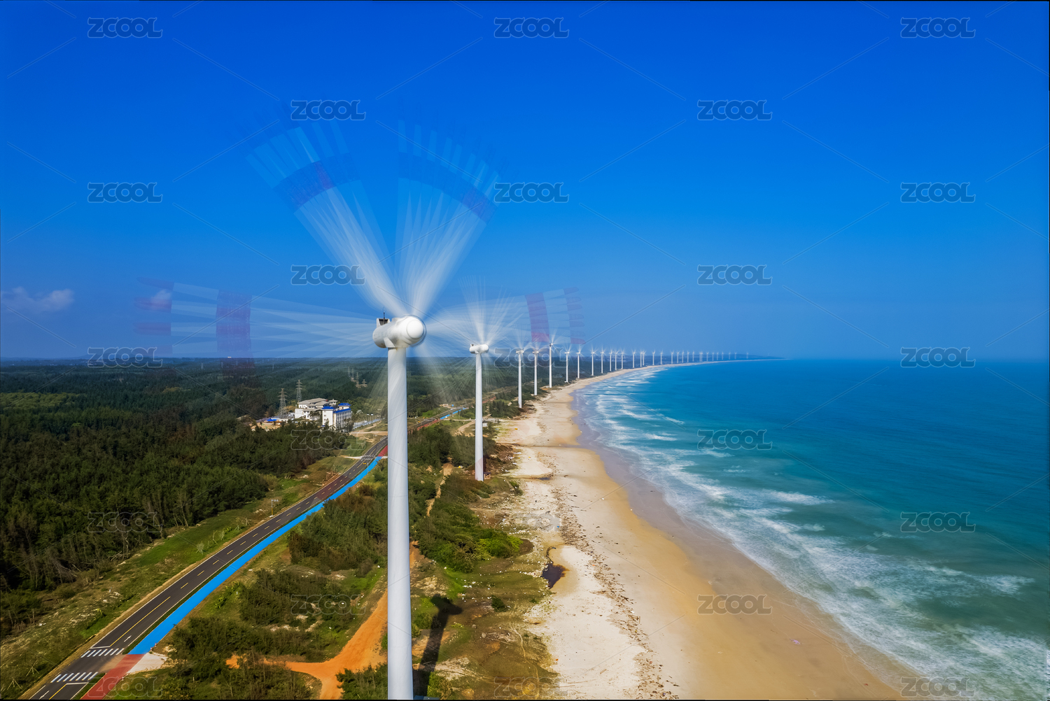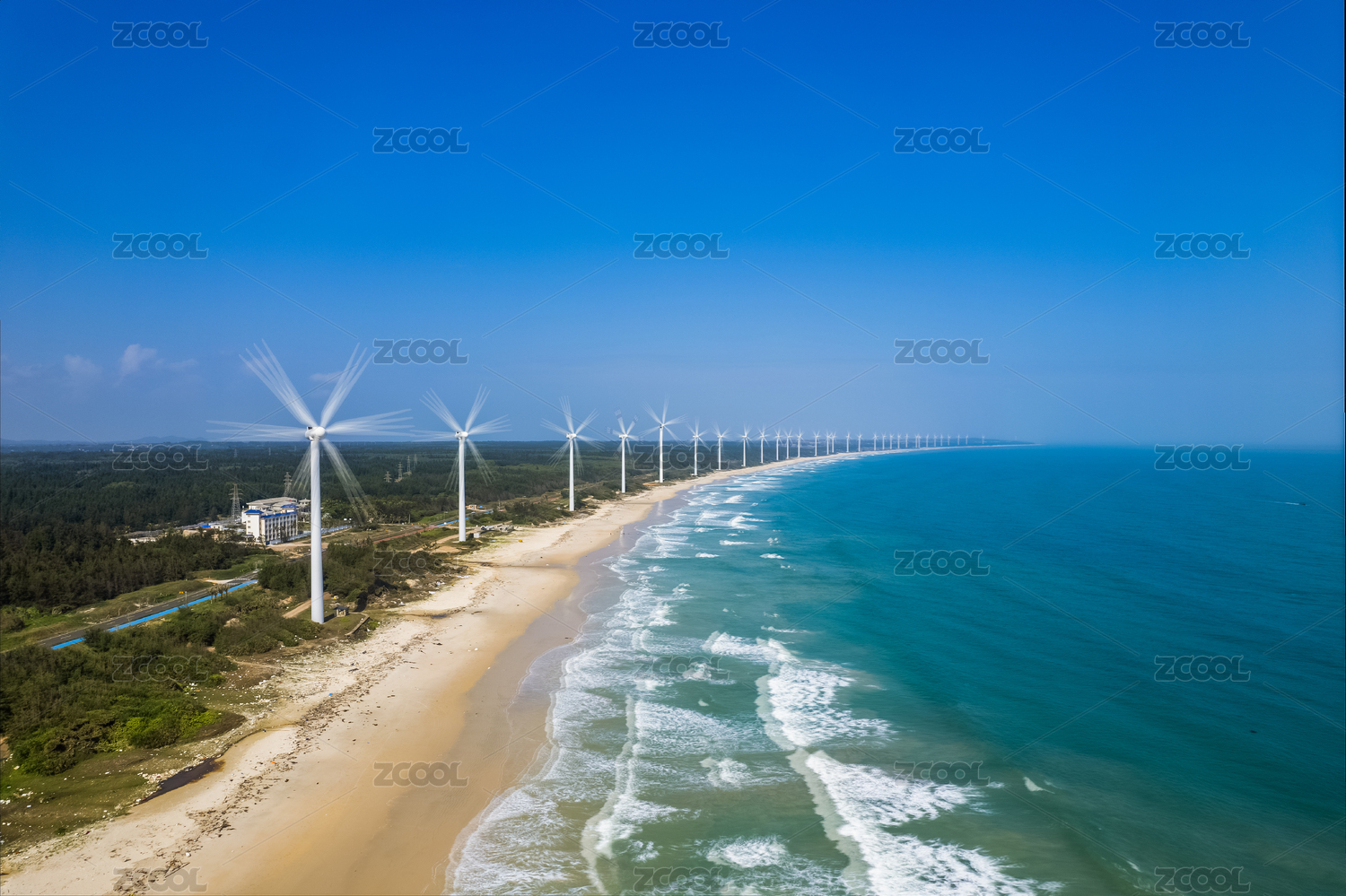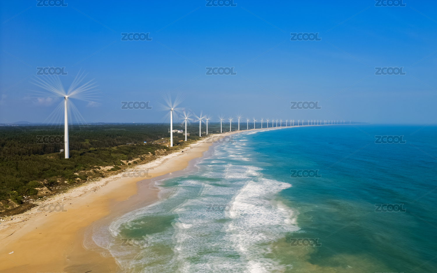 俯瞰海口海岸边排成一线转动着的风力发电机