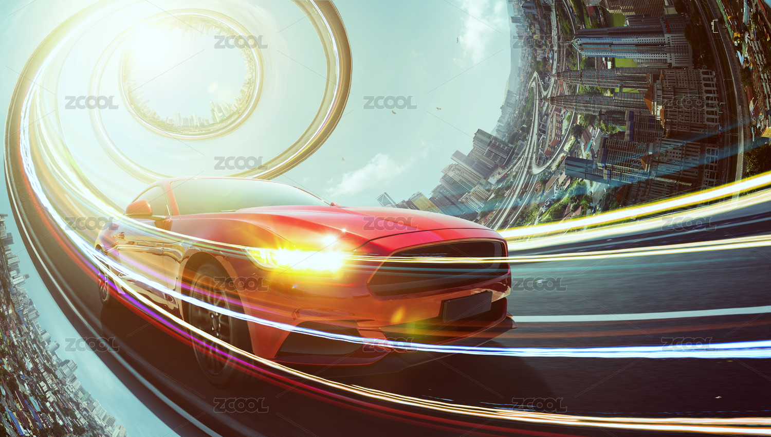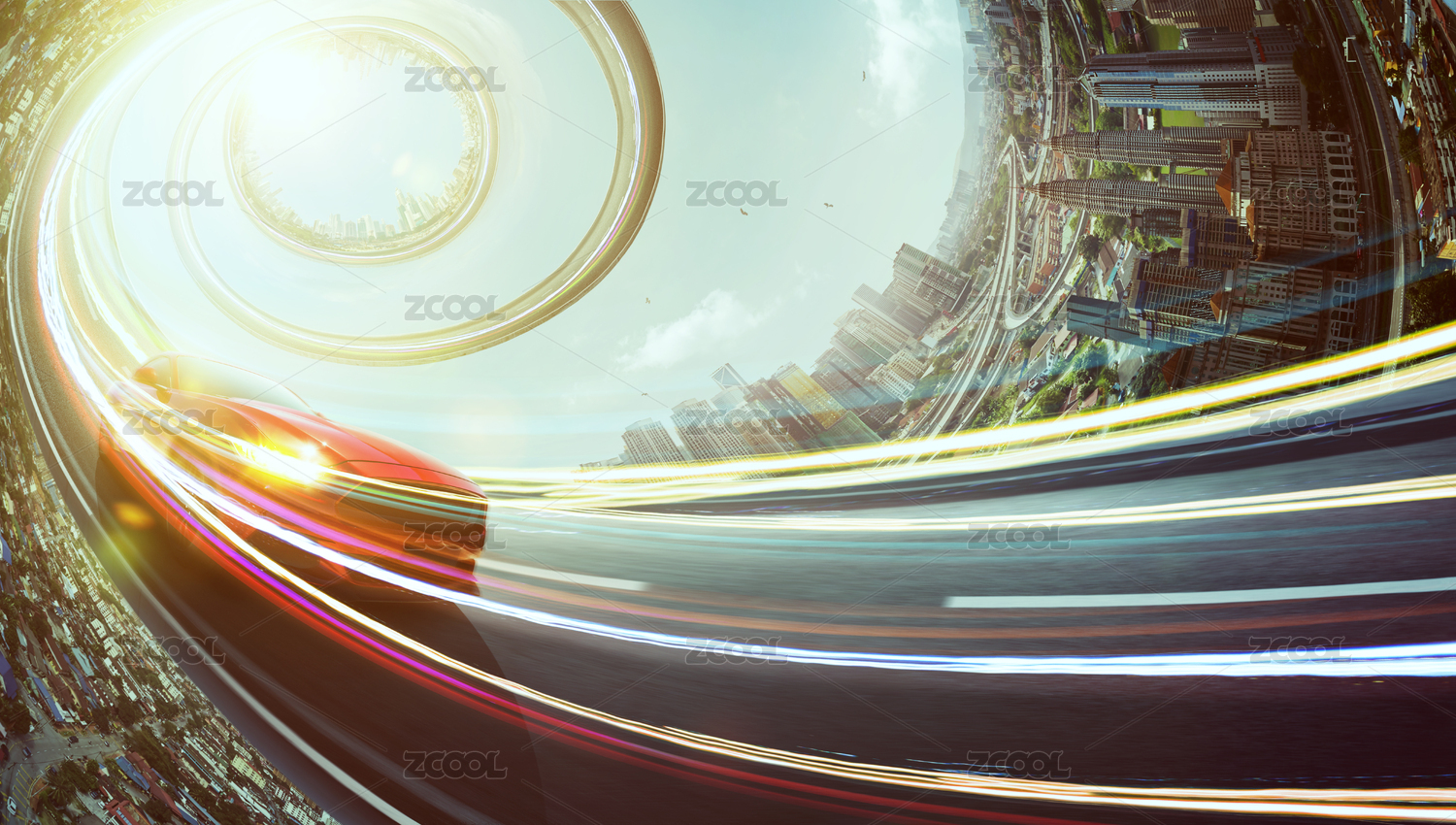 红色包车奔驰在抽象转动扭曲的高速公路与城市