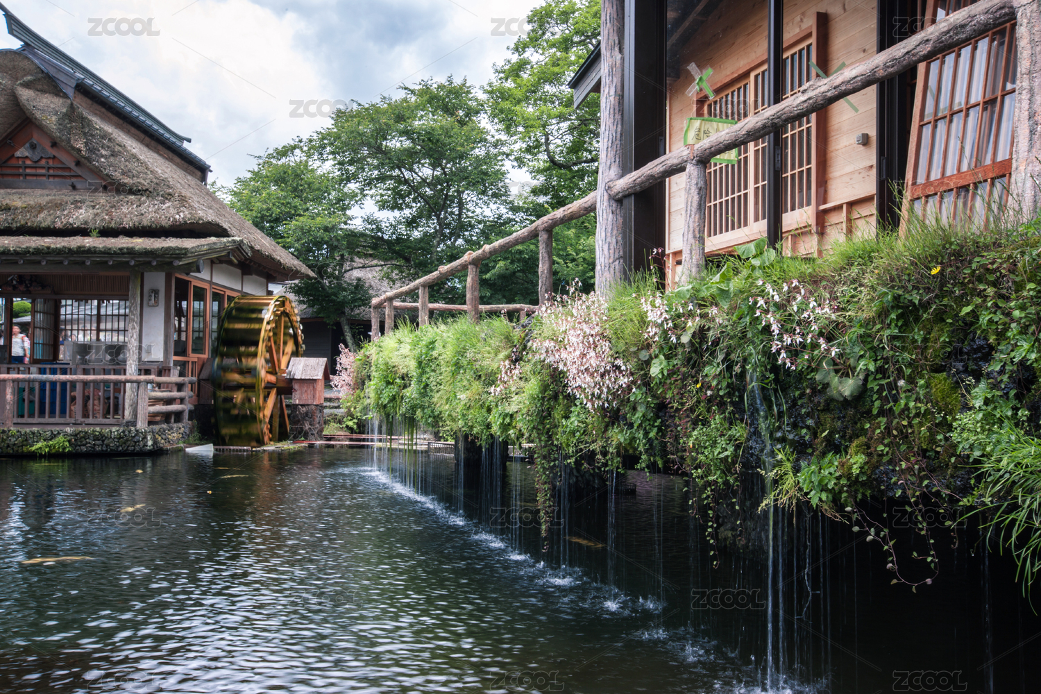转动的水车和流动的水流/日本忍野八海