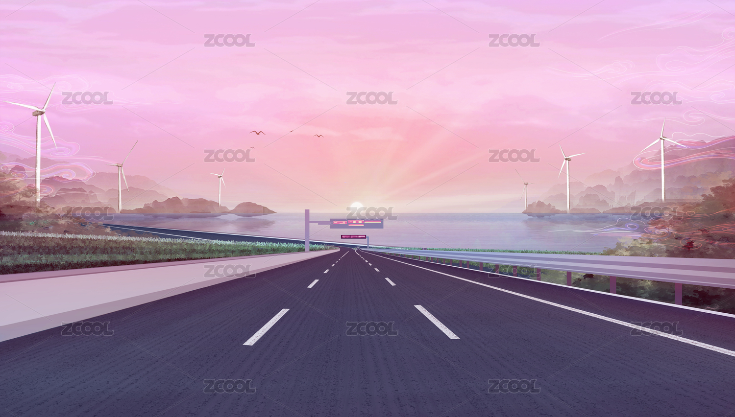 海边美丽晚霞照耀路面而风车在转动插画