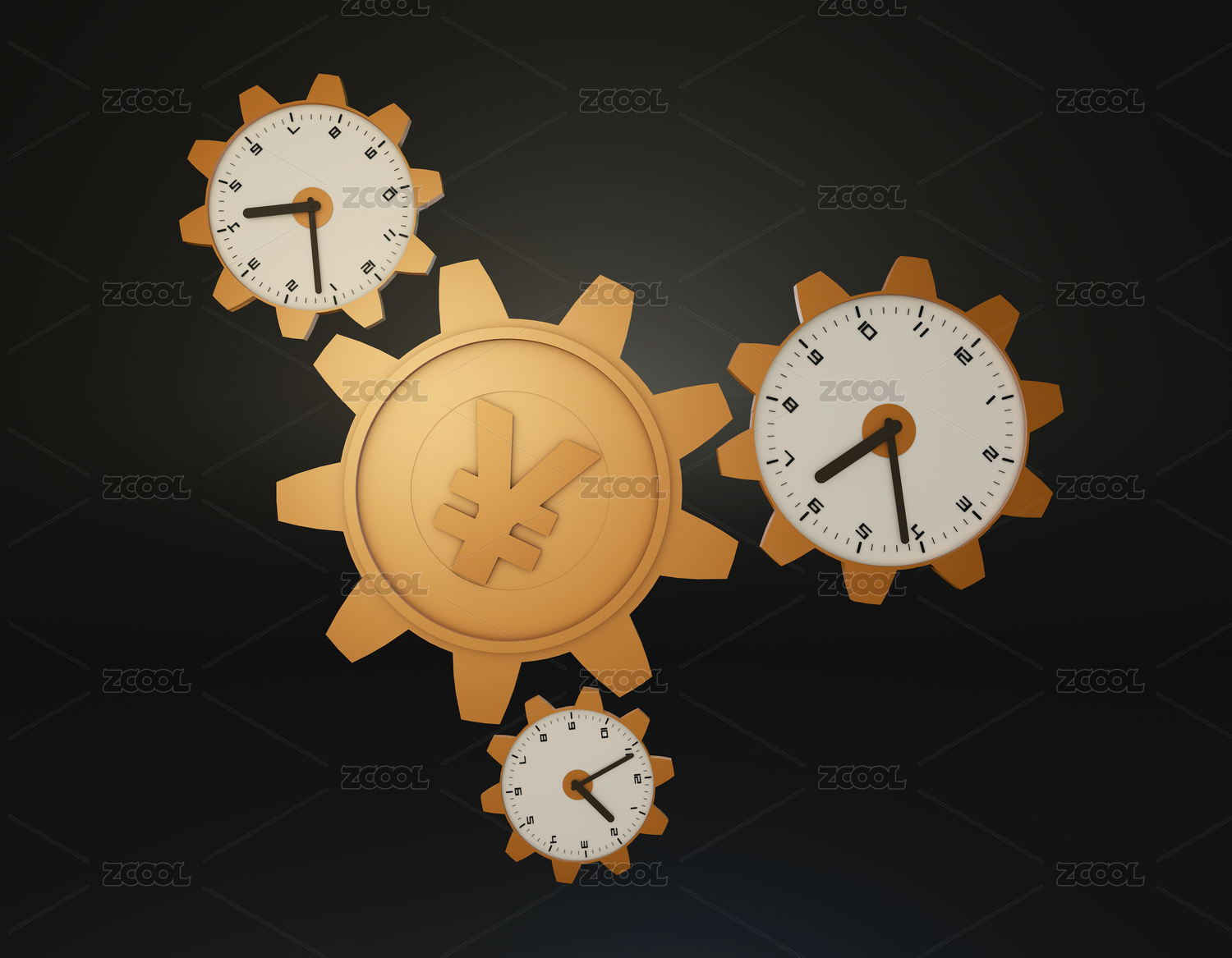 人民币符号齿轮与时钟齿轮相互连接转动,代表着时间就是金钱与时间的积累创造财富