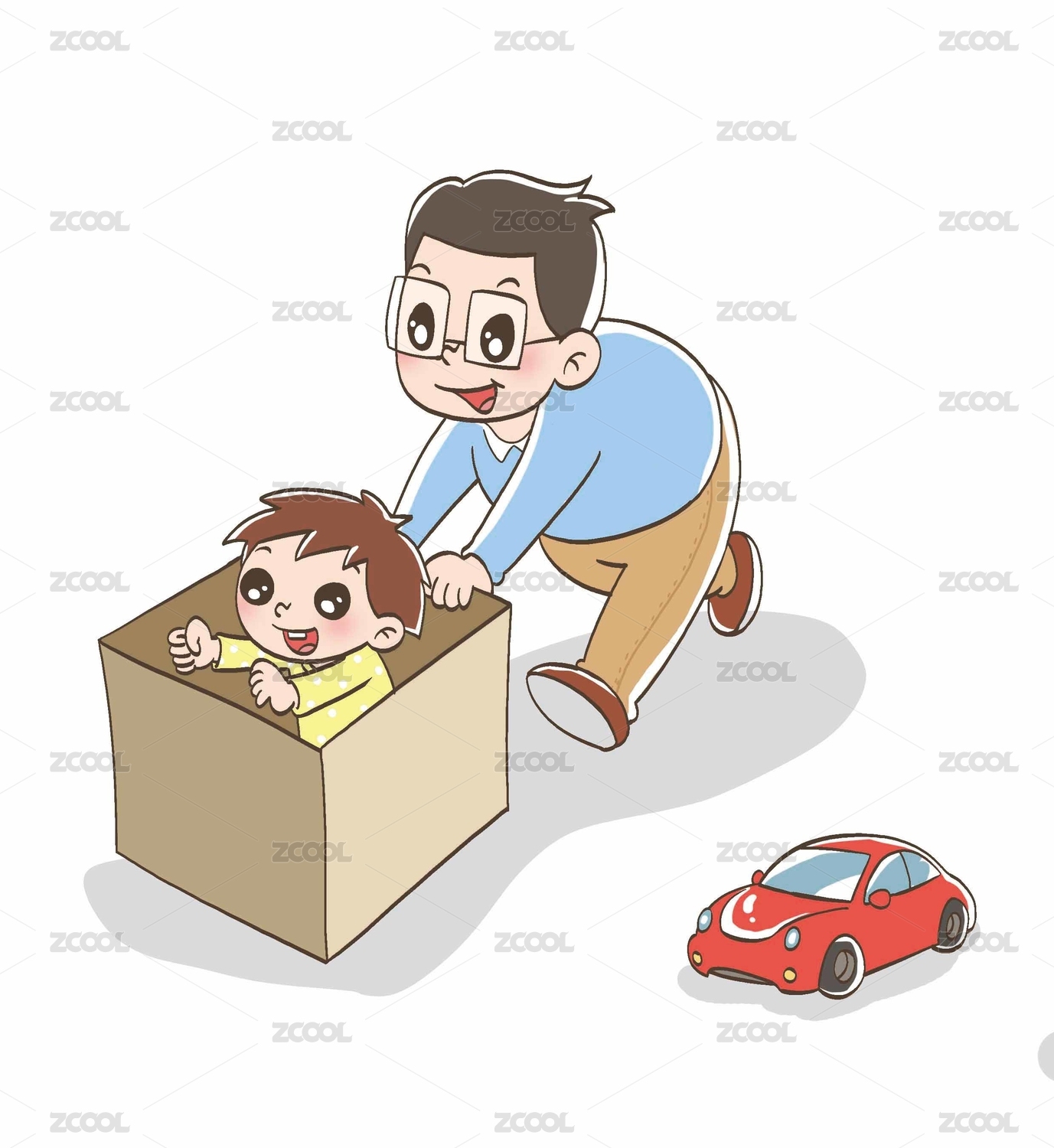 爸爸推着装有宝宝的箱子,箱子里的宝宝摆出转动方向盘开车的动作