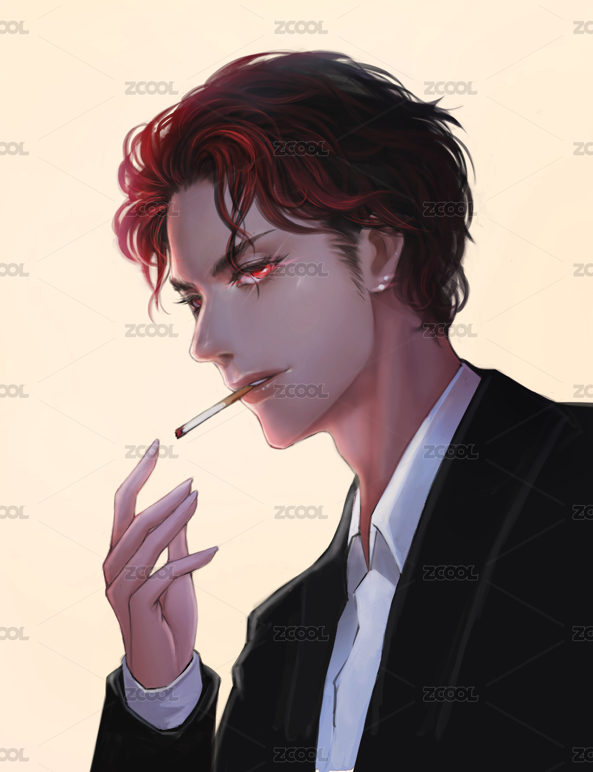 漫画风叼烟红发帅哥卡通原画插画人物素材