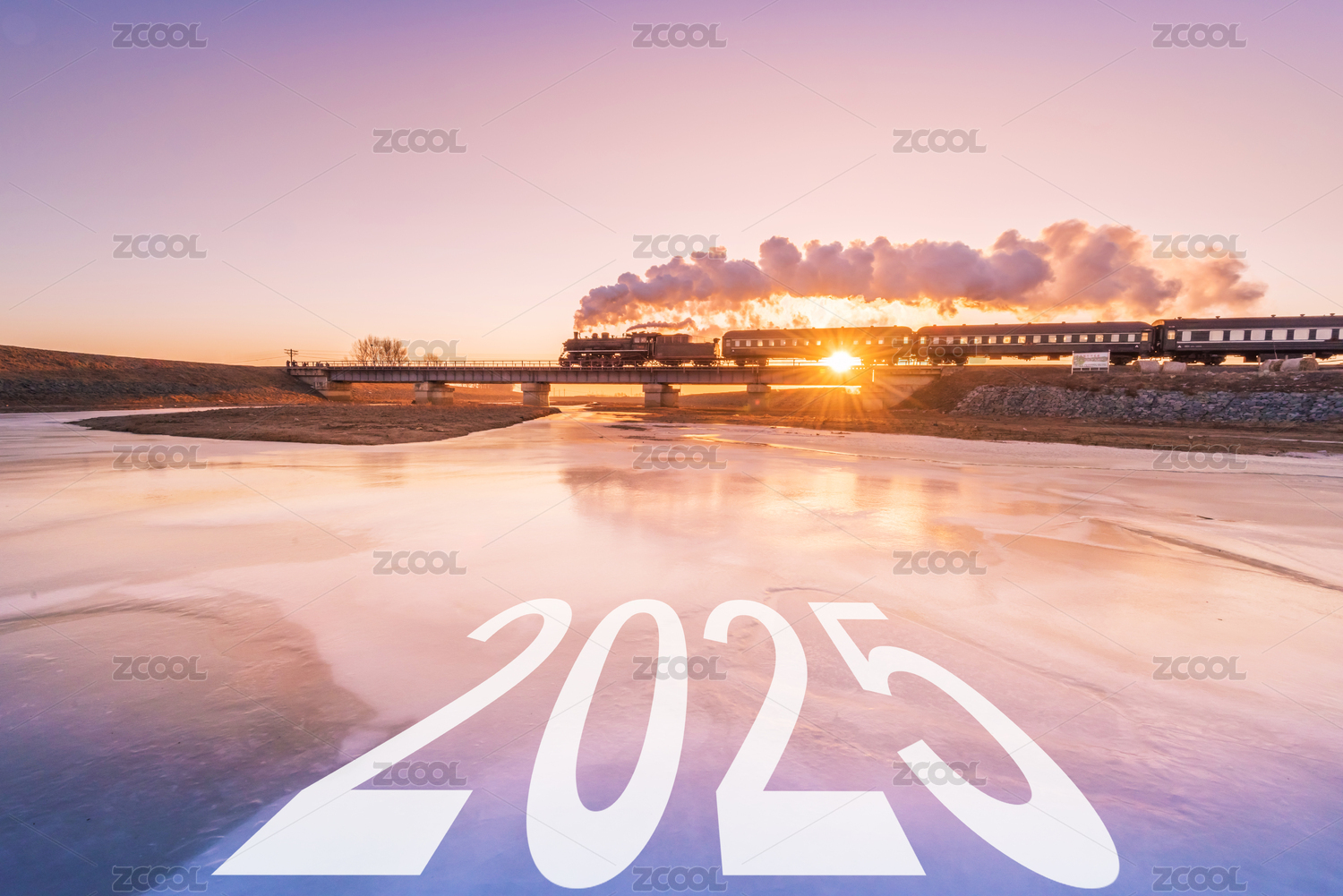 2025新年元旦日出冰河上的铁路蒸汽机车