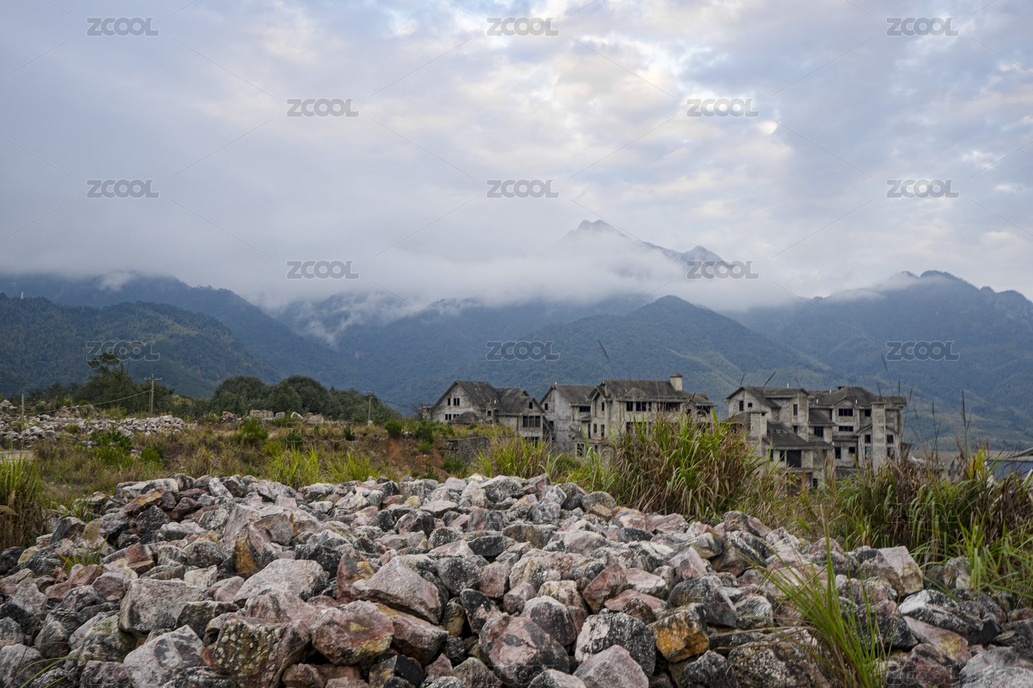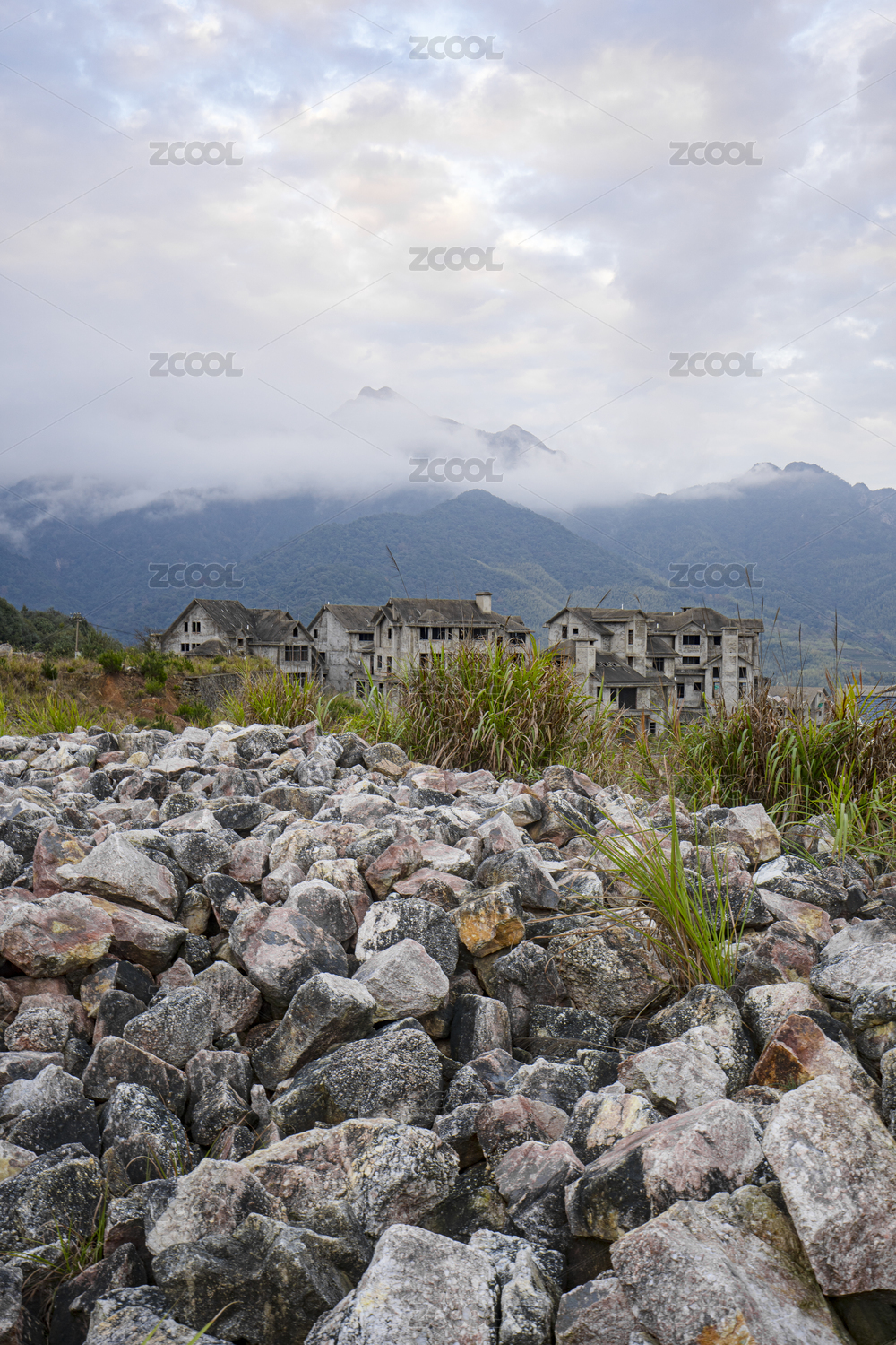 云雾缭绕的山腰及山脚下未完工的别墅和石堆