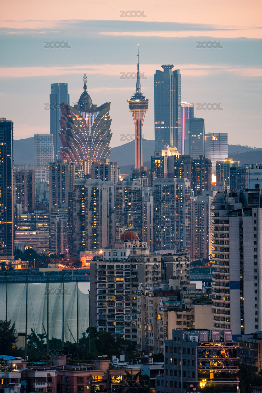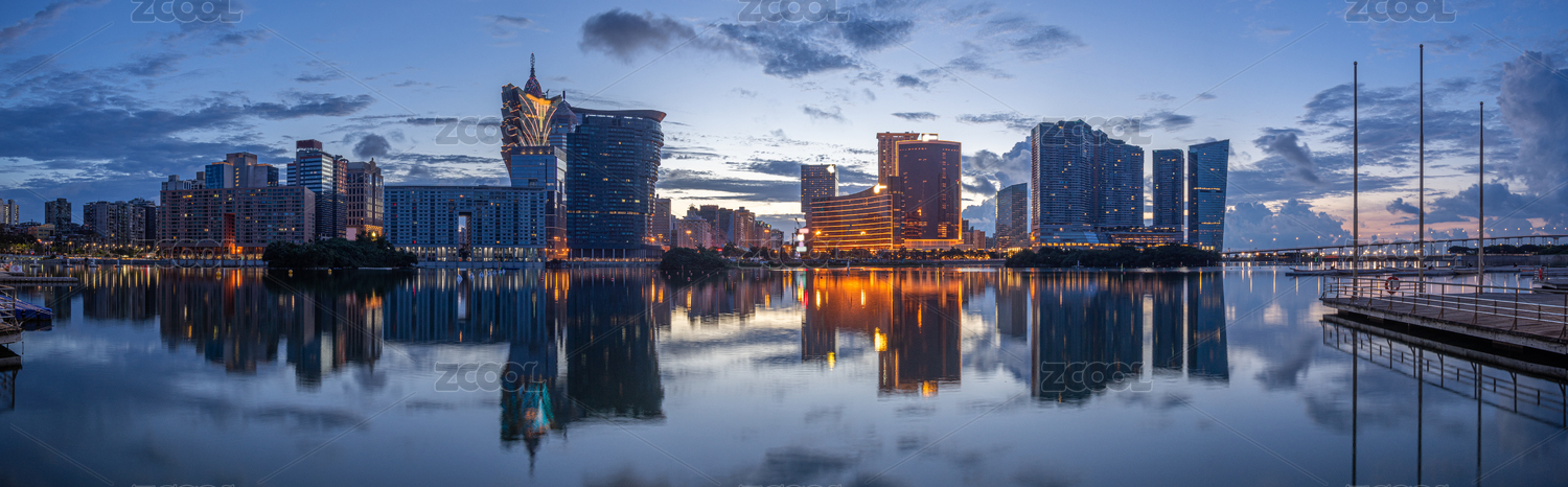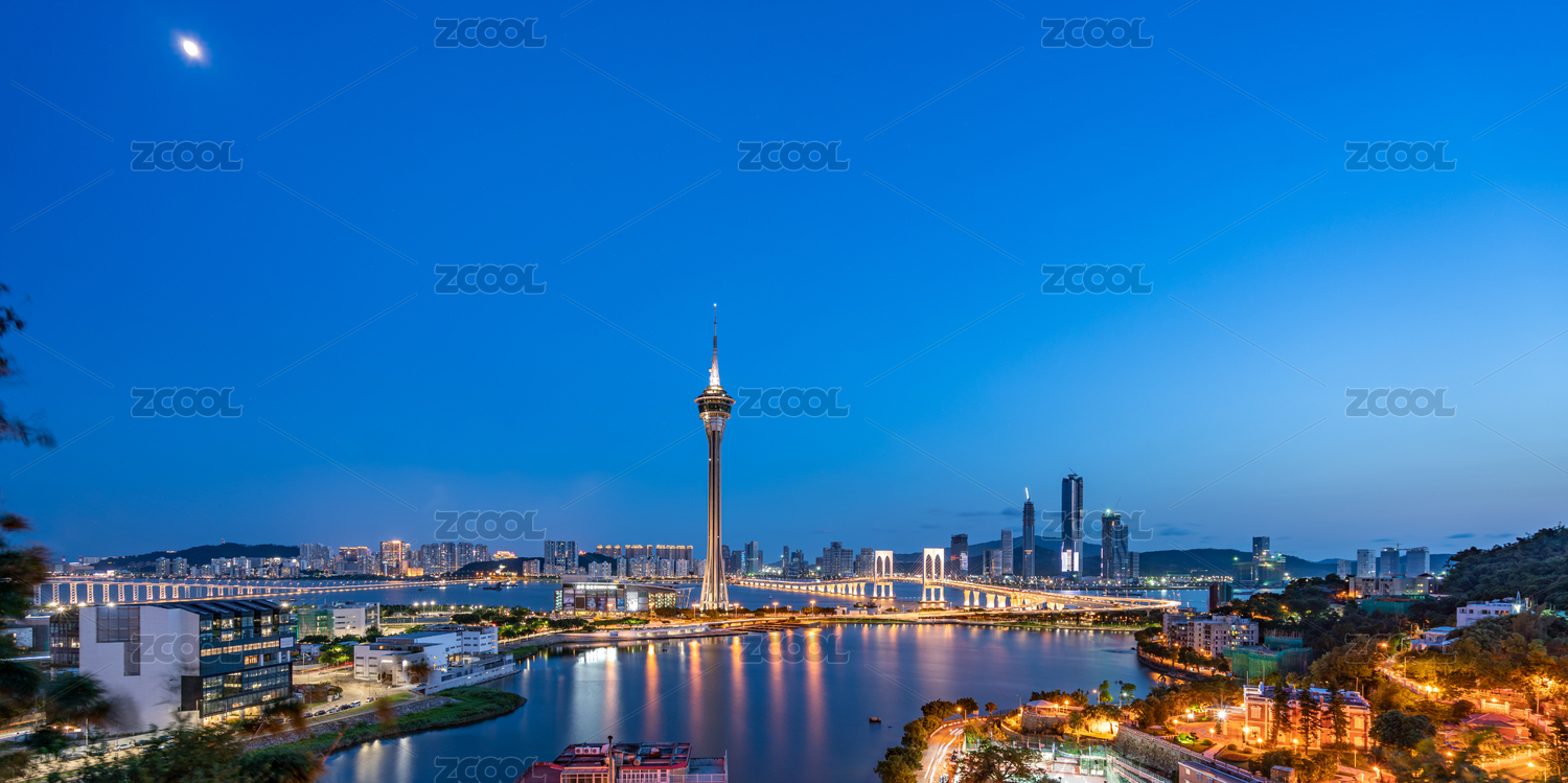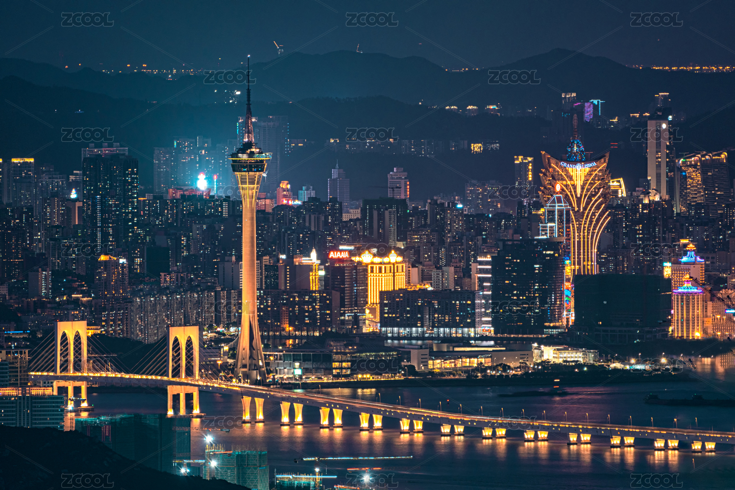 中国粤港澳大湾区澳门与珠海横琴城市天际线夜景