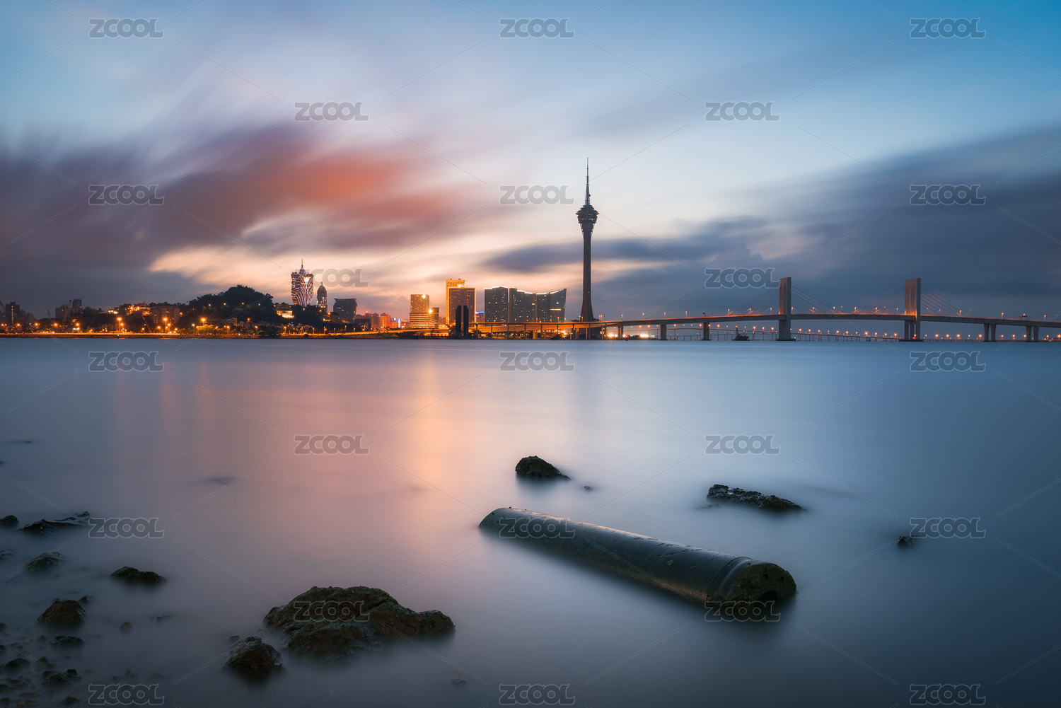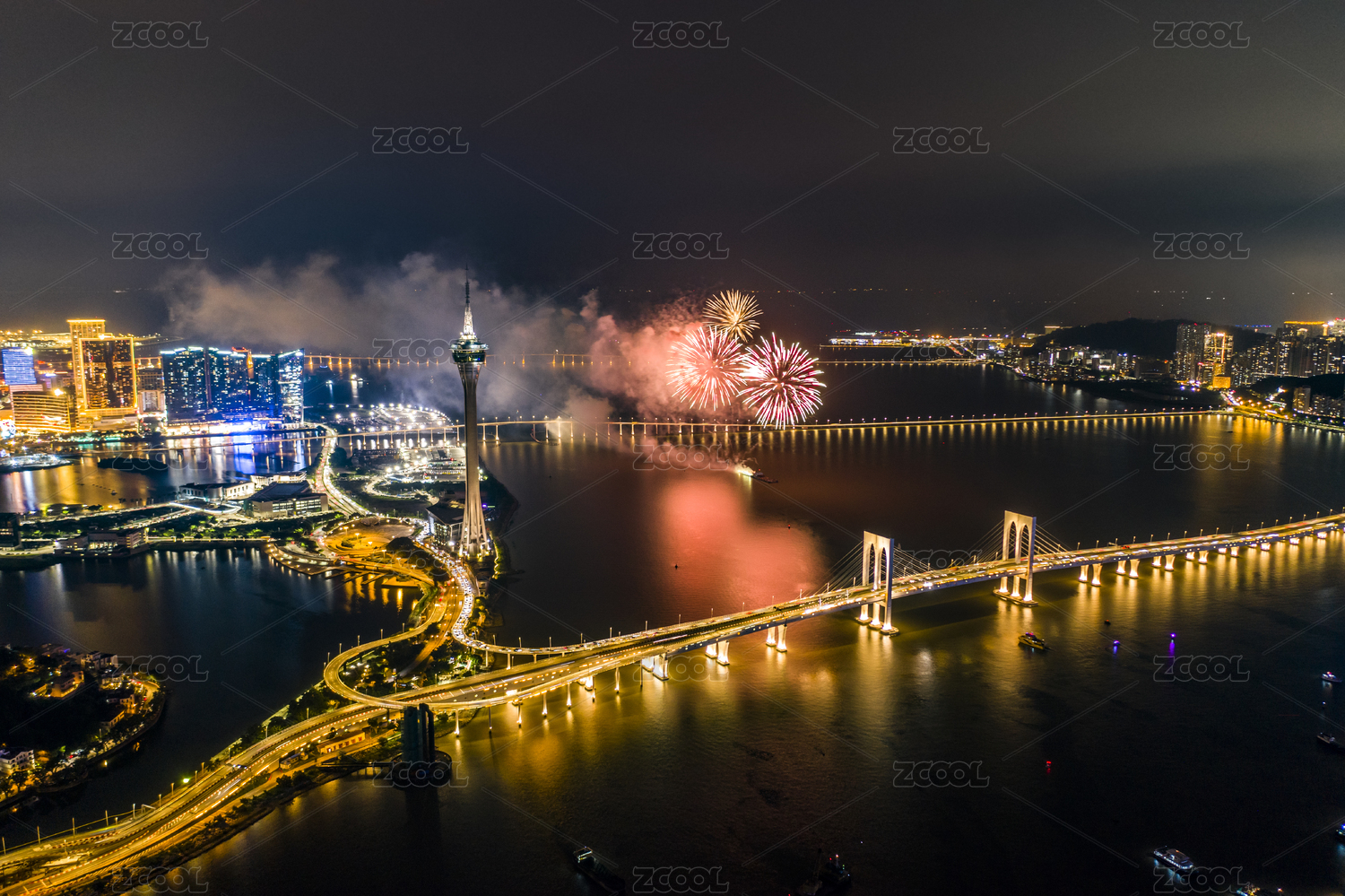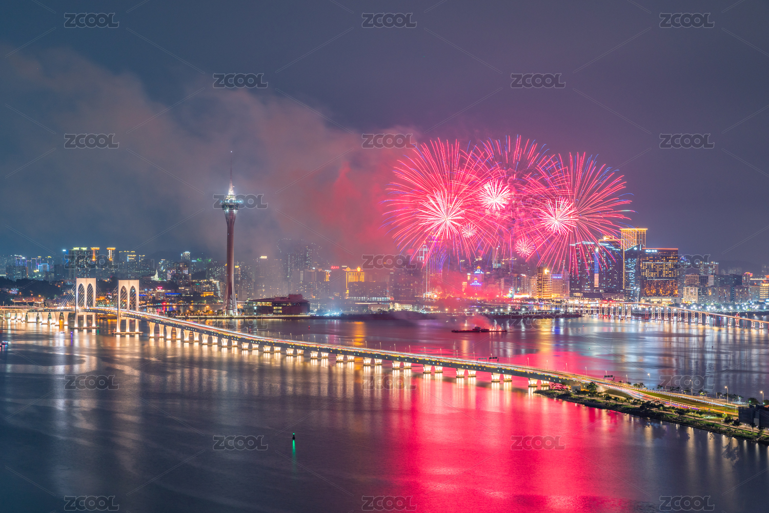 中国粤港澳大湾区澳门与珠海横琴城市天际线夜景