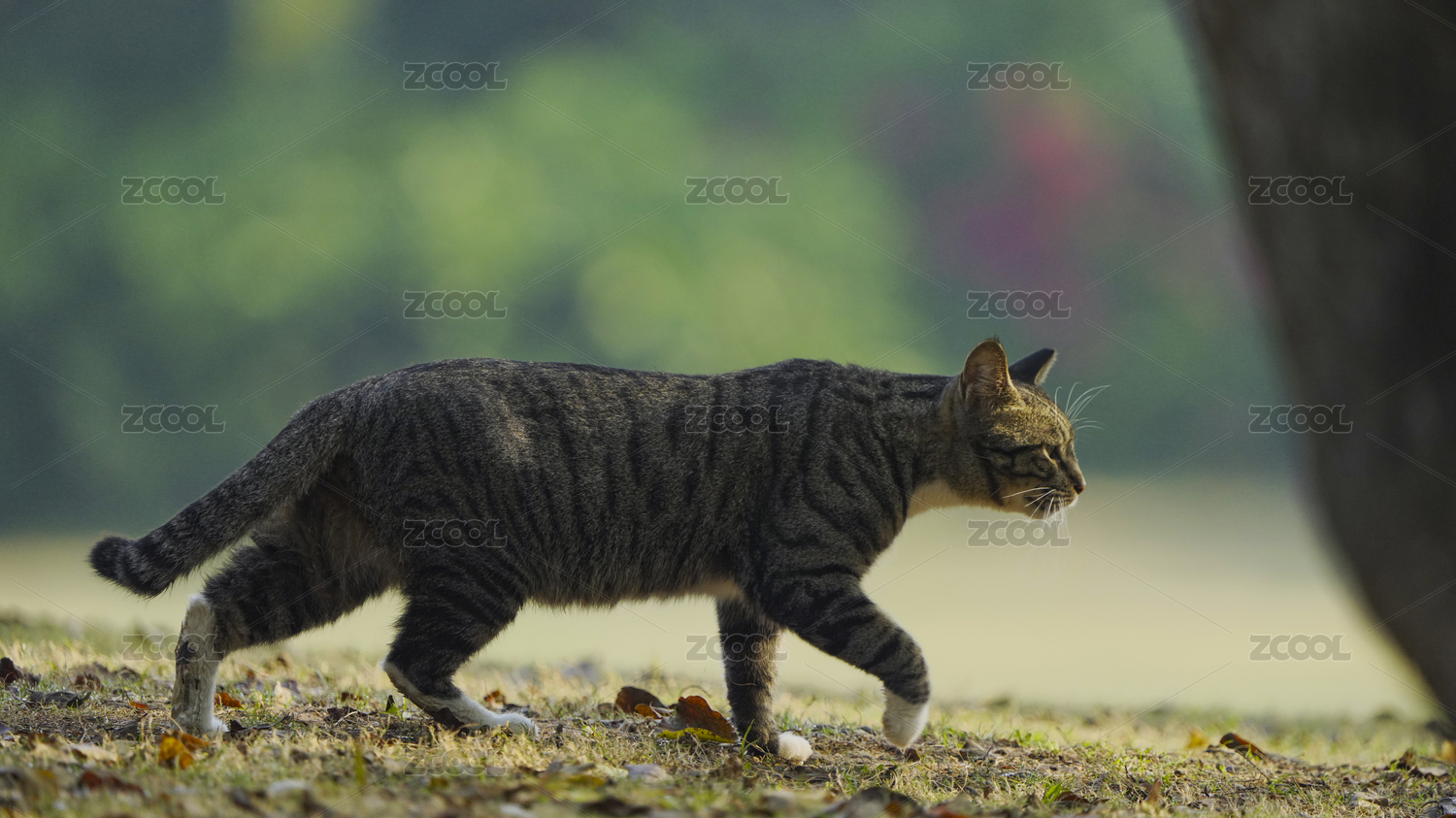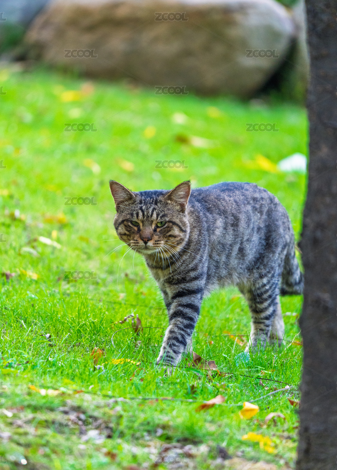 草坪上从树后走向镜头的虎斑猫
