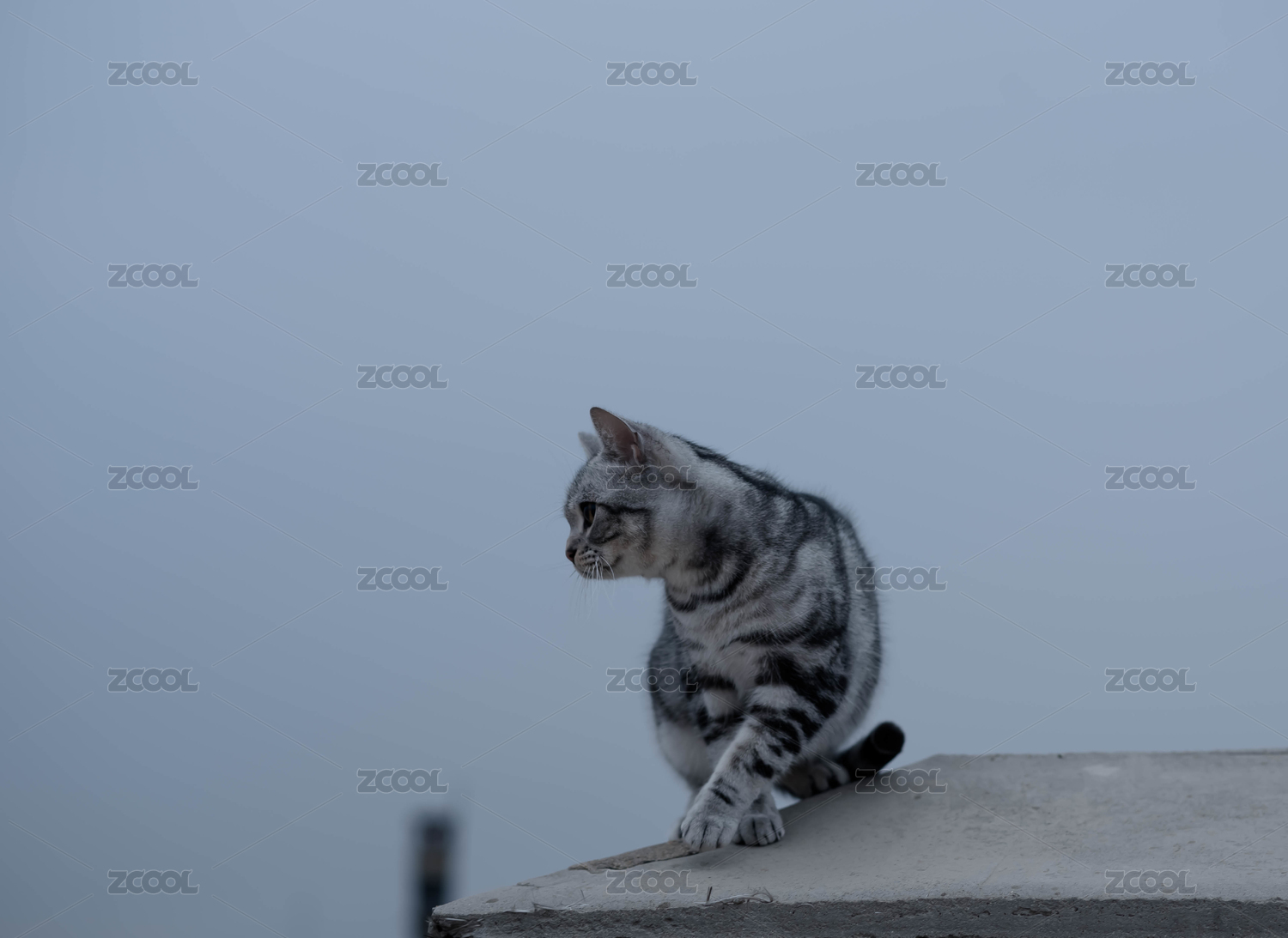 一只美国短毛猫虎斑猫坐在天台上向右看