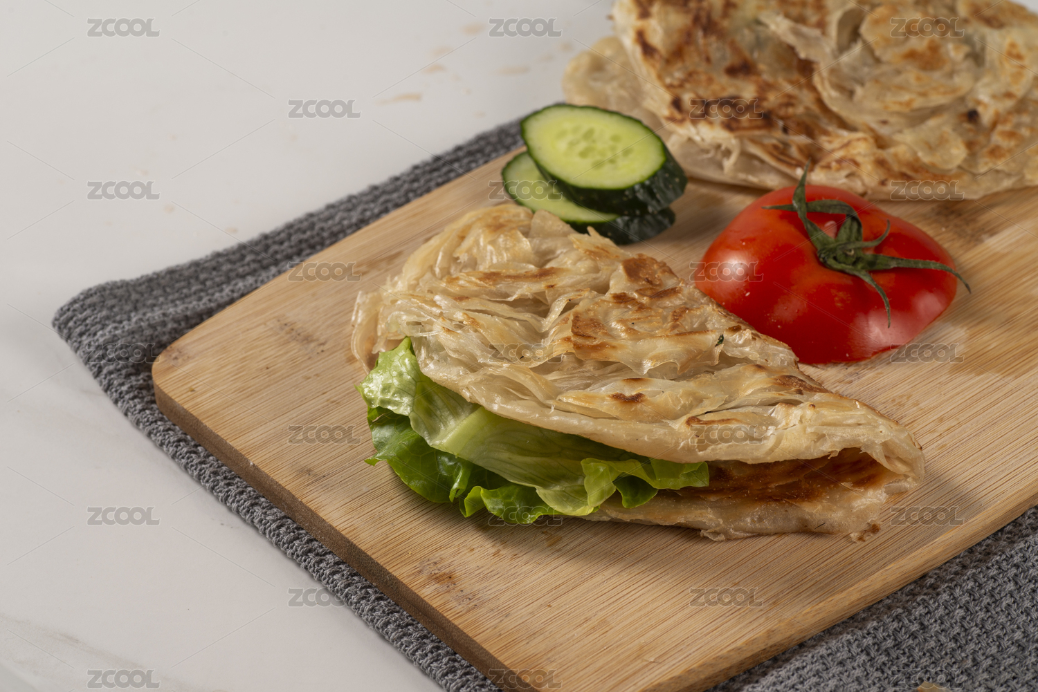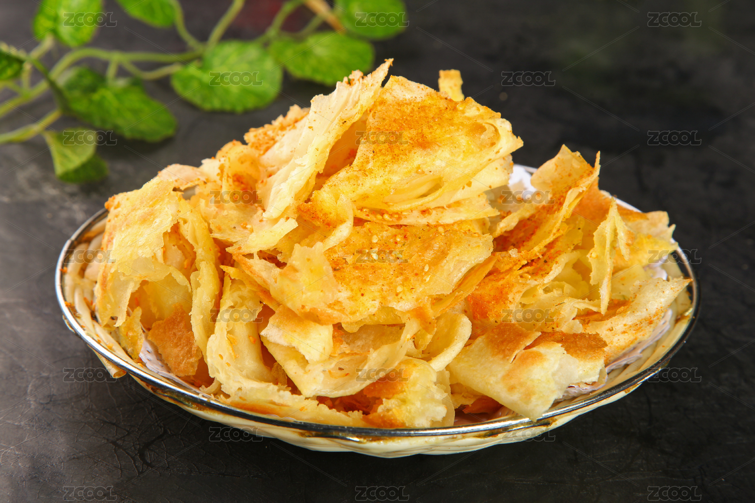 盘子里装着的手抓饼放在黑色背景蓝布上