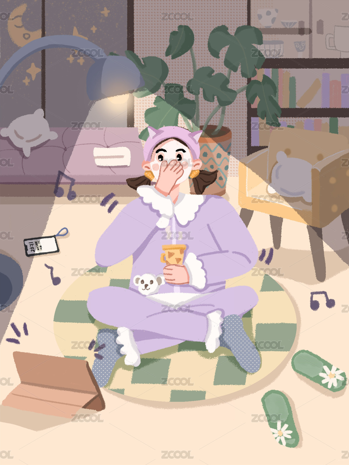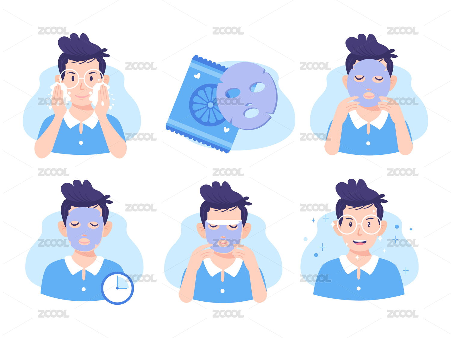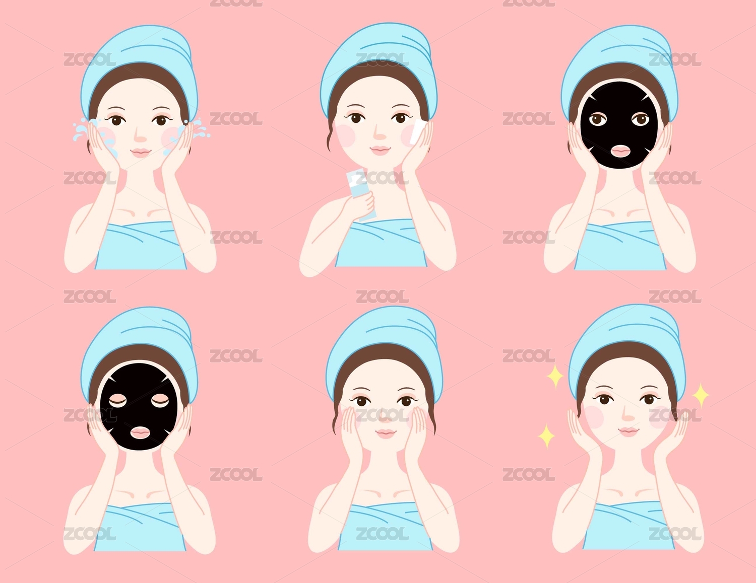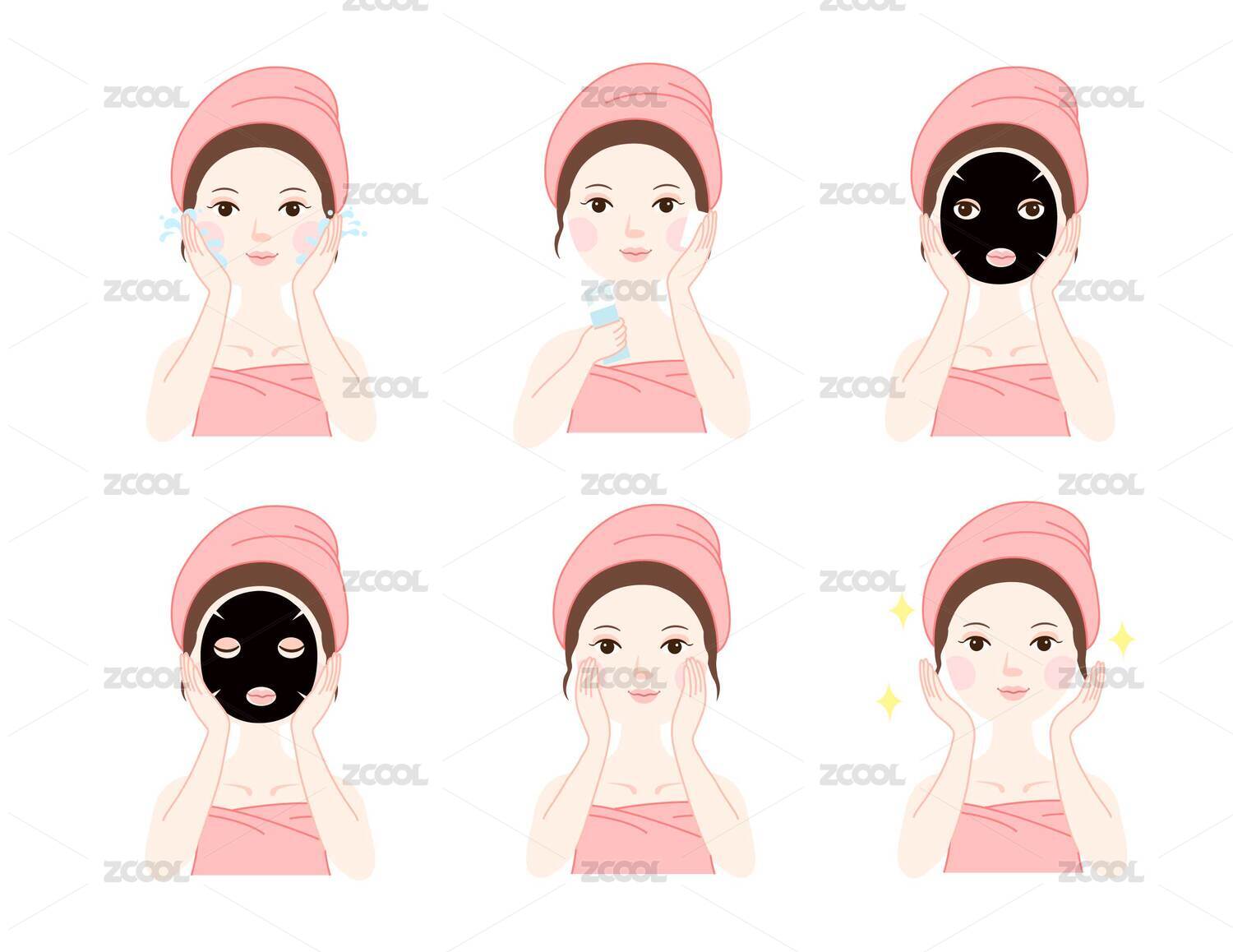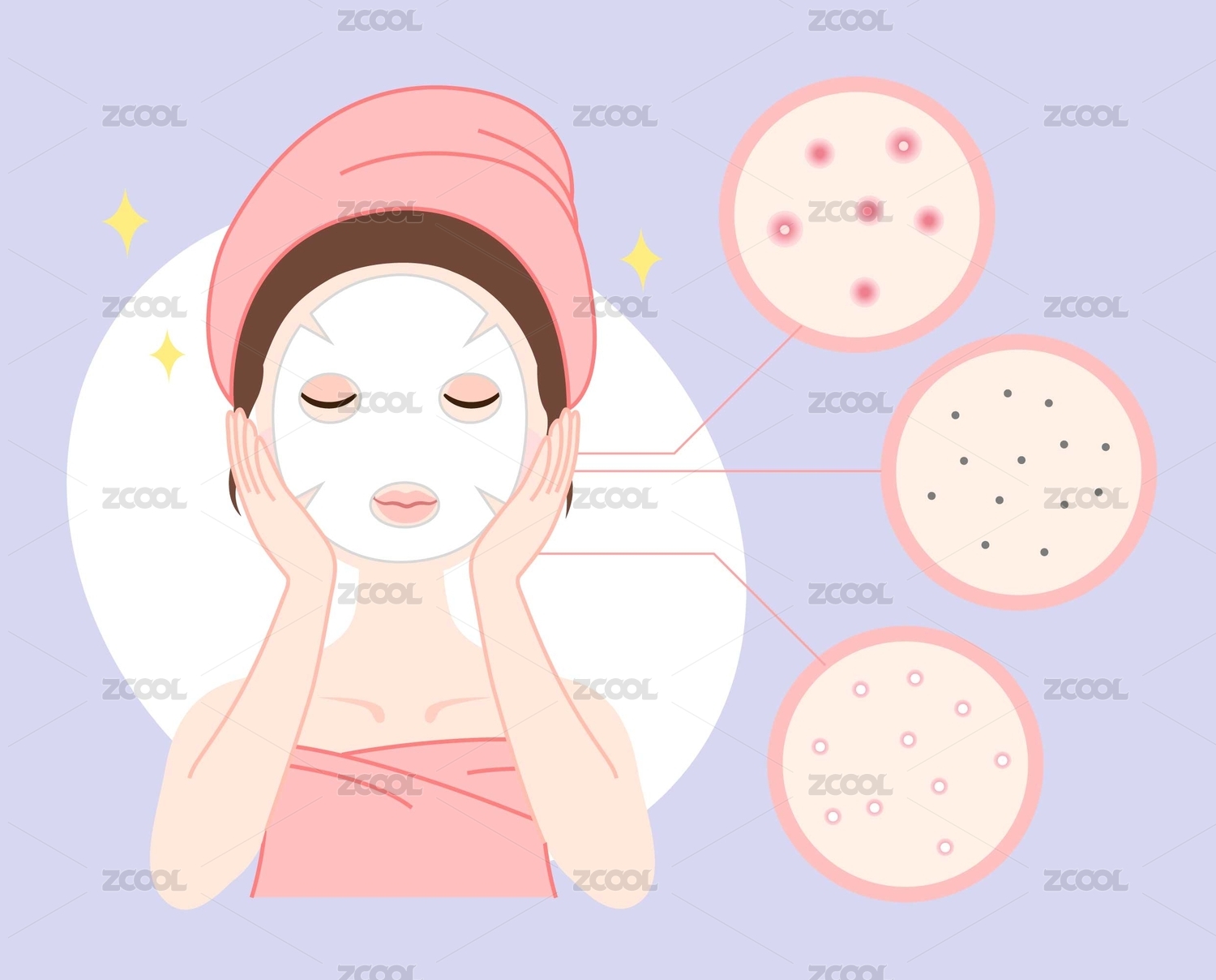 敷面膜美容护肤祛痘卡爱女孩矢量插画