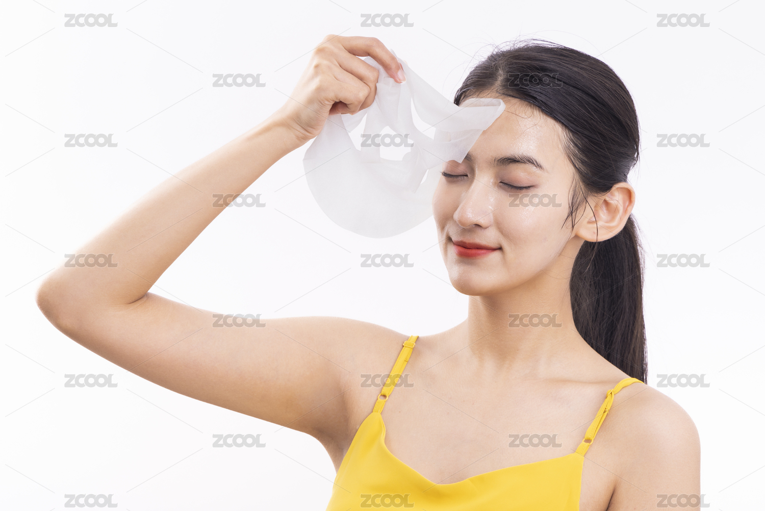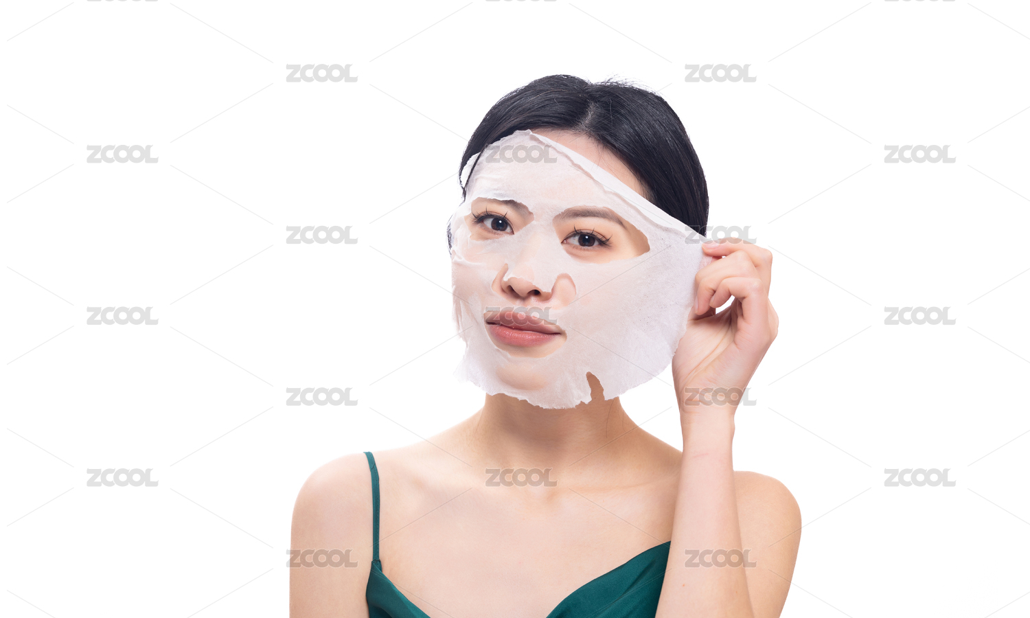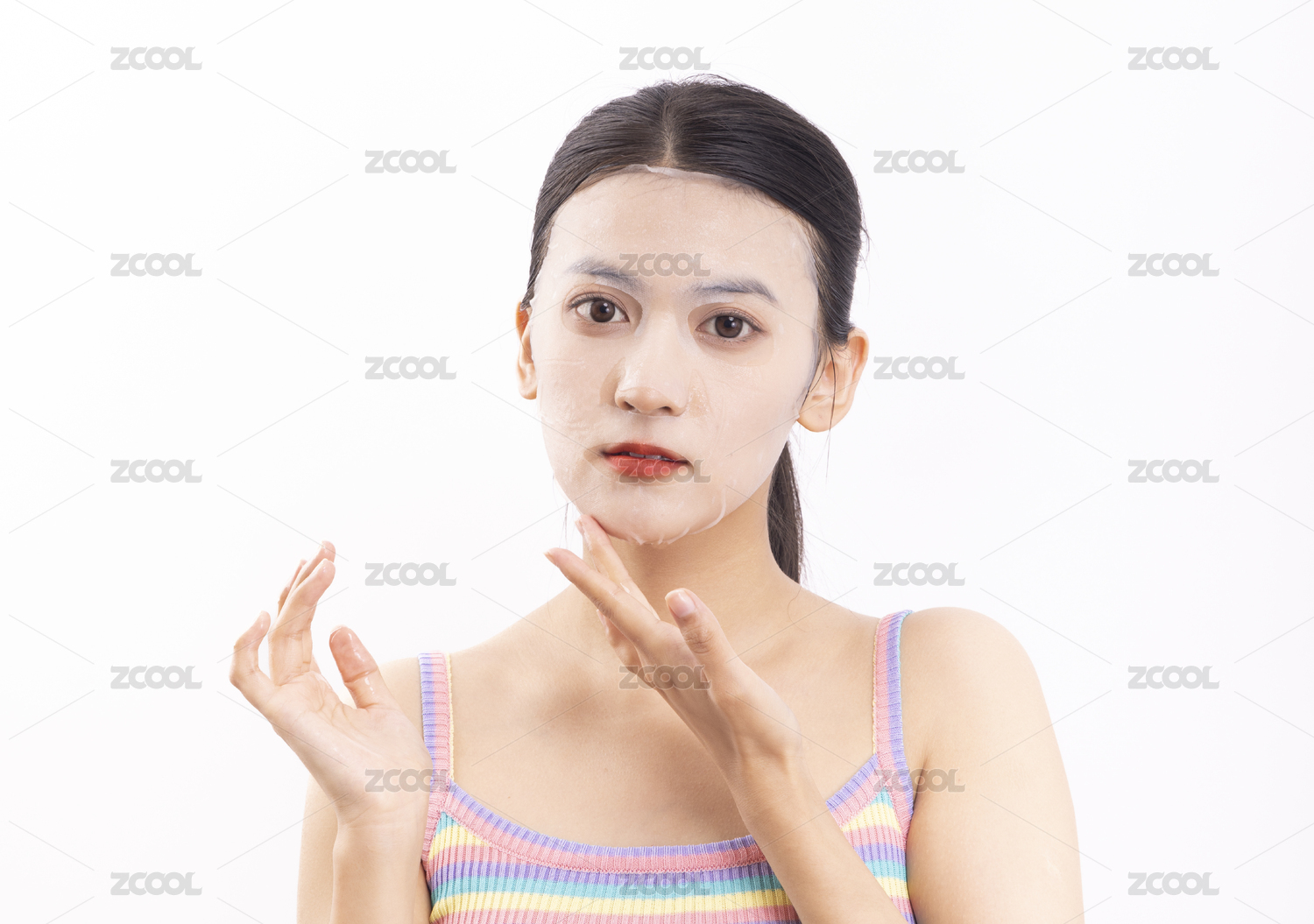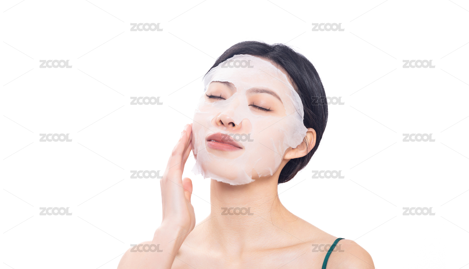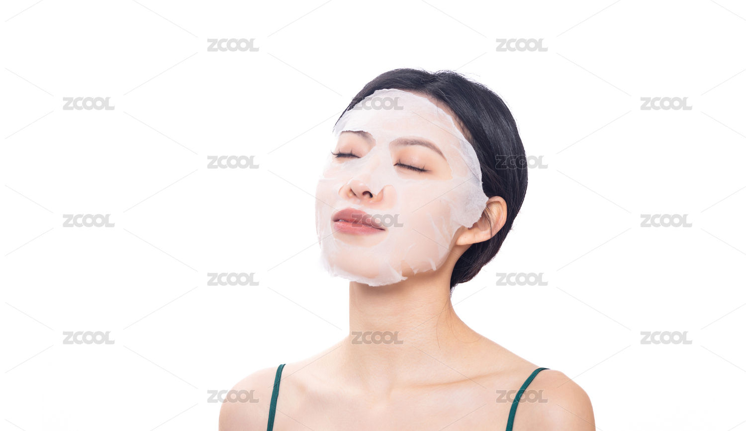 一个在白色背景前敷面膜的的年轻亚洲女性
