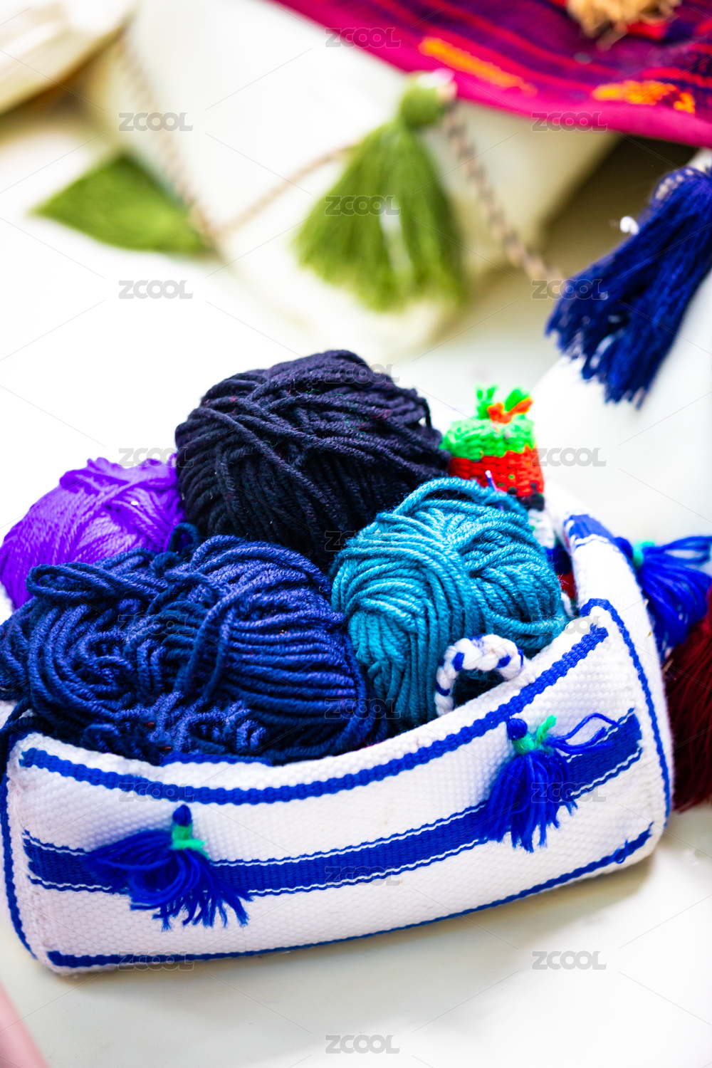 几个彩色的毛线球放在织物包中
