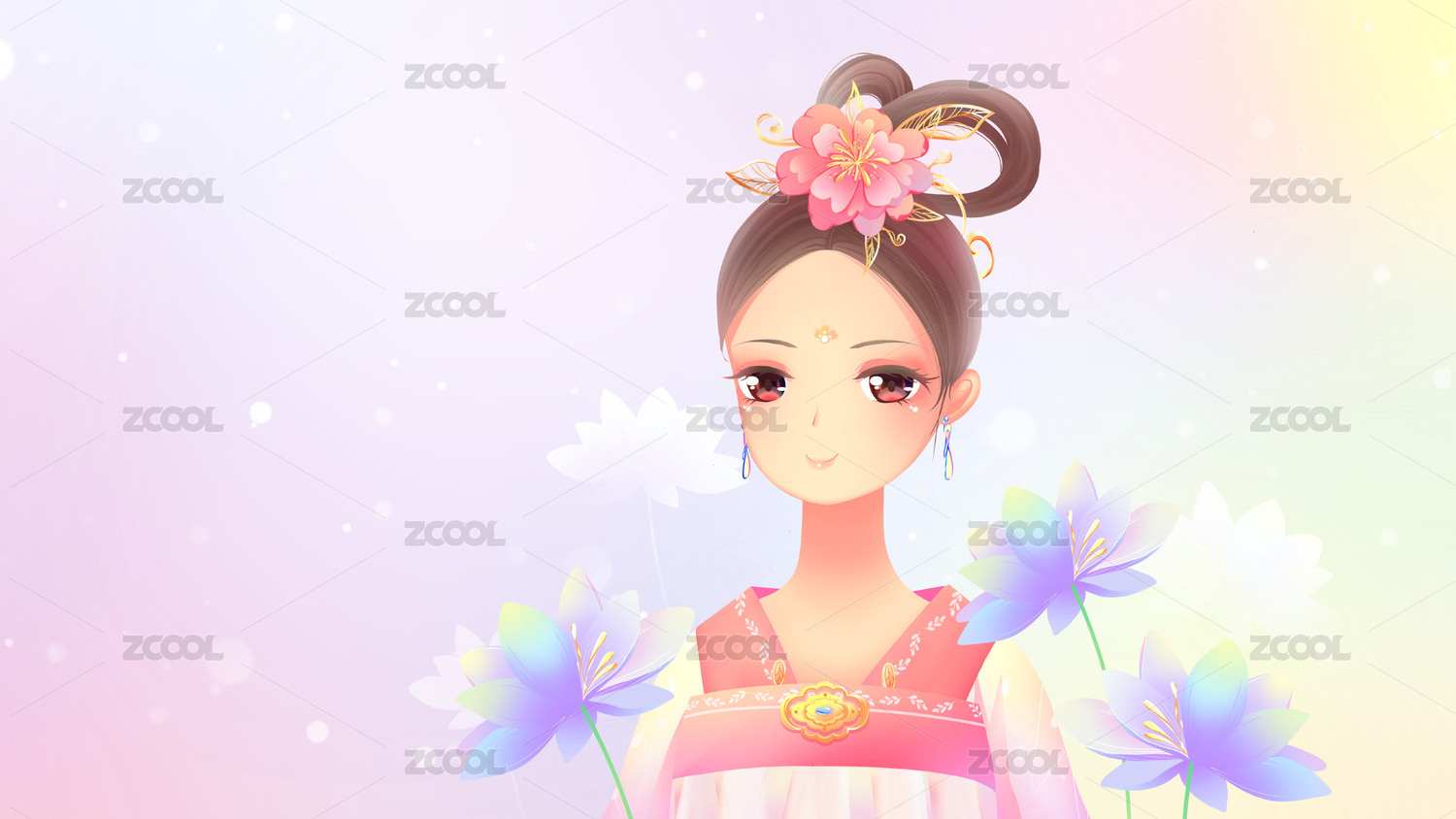 唐朝美人贵妃手拿粉红色桃花踽踽前行