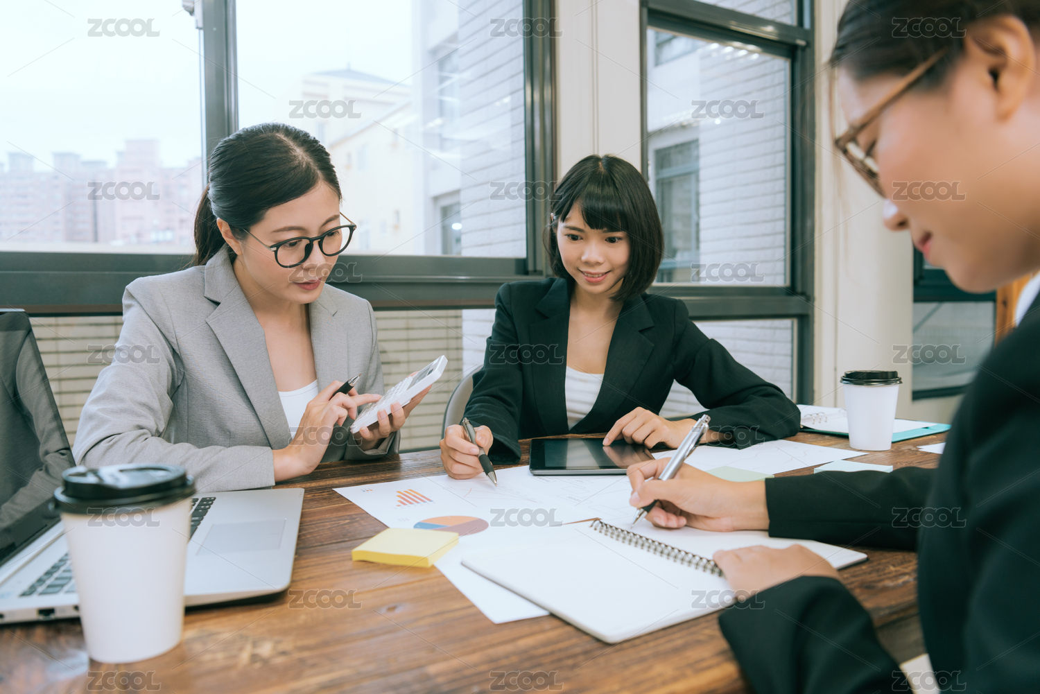 使用计算器的团队合作会议期间计算公司的财务预算,并讨论案策划漂亮年轻的上班族。选择重点照片。