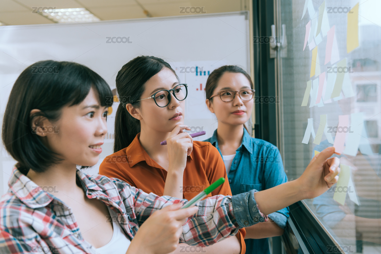 在玻璃幕墙专业的年轻女设计师团队会议,看着许多粘便笺纸思考讨论设计策划案例。