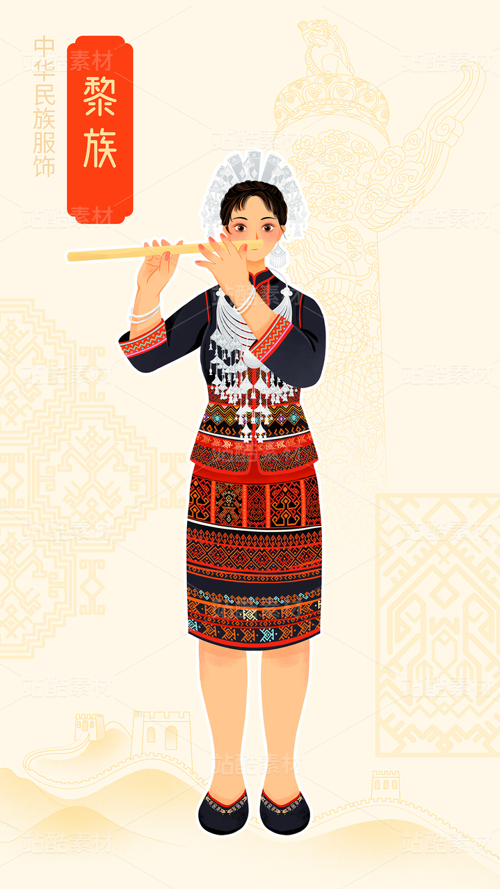 中国五十六个民族瑶族红瑶少女盛装女性服饰插画