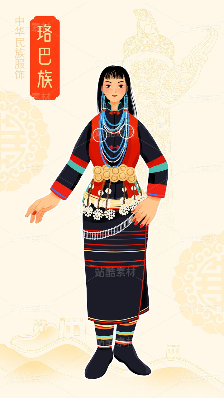 中国五十六个民族珞巴族少女盛装女性服饰插画
