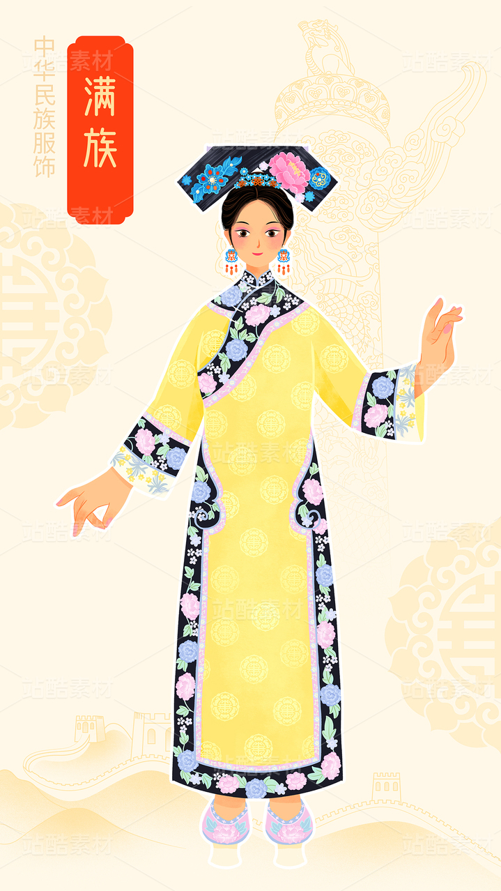中国五十六个民族锡伯族少女盛装女性服饰插画