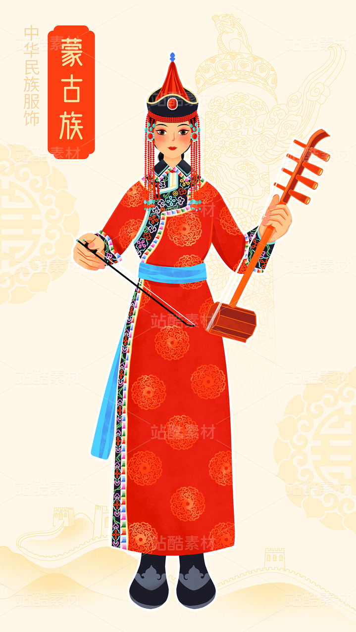 中国五十六个民族蒙古族少女盛装女性服饰插画