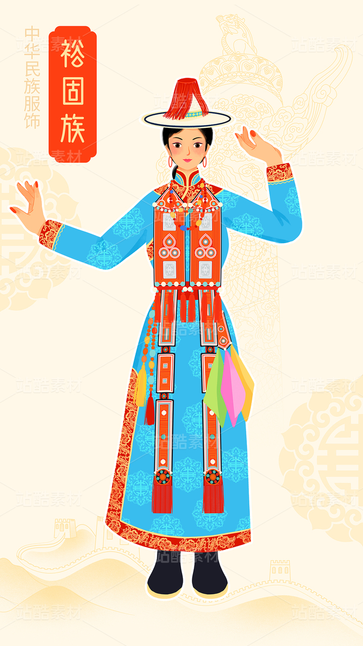 中国五十六个民族裕固族少女盛装女性服饰插画