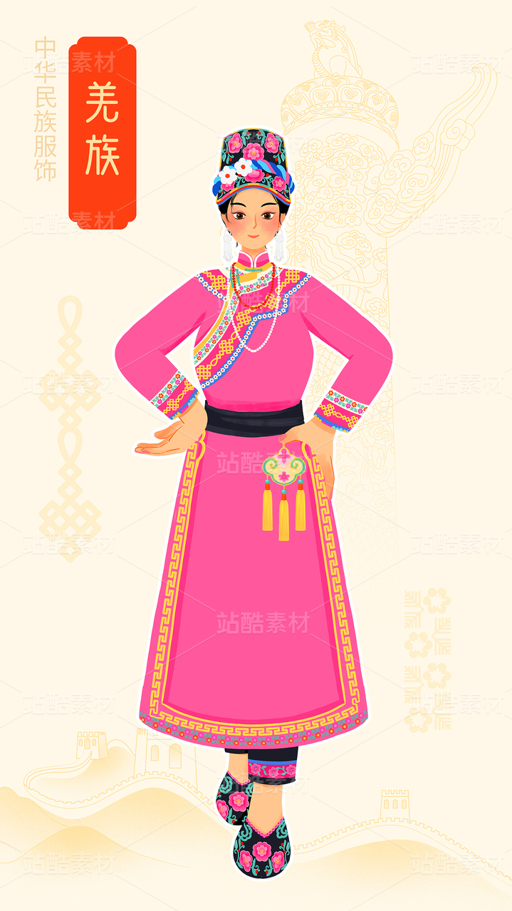 中国五十六个民族傈僳族少女盛装女性服饰插画