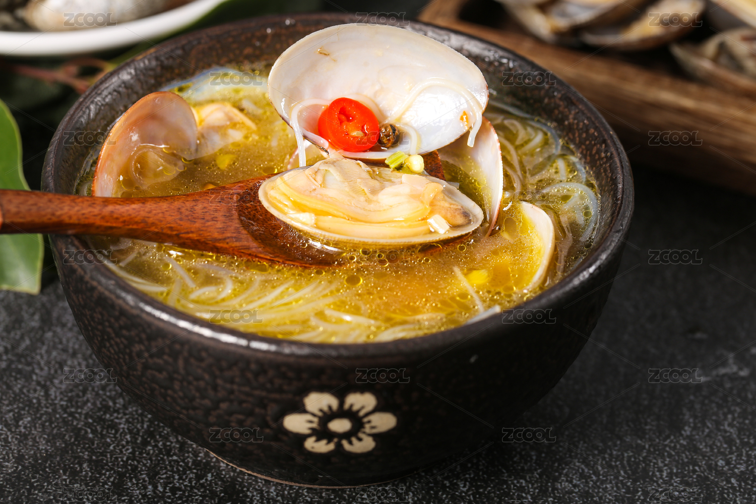 黑底上放着一碗花甲粉丝汤和勺子上挖着花甲