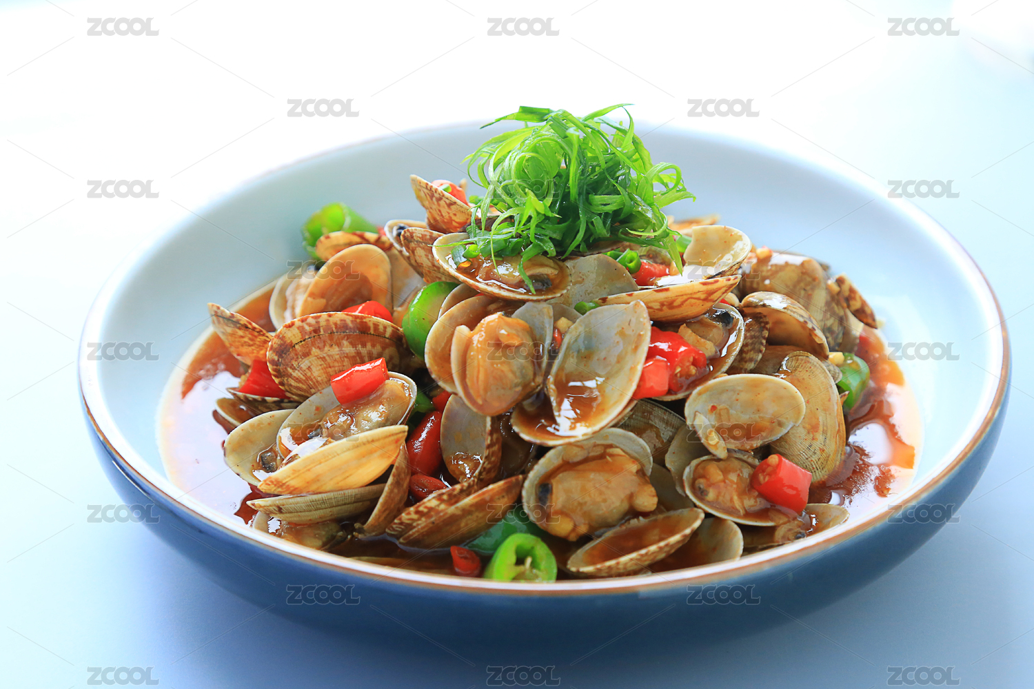 浅色背景上的一盘炒花甲,点缀着葱丝
