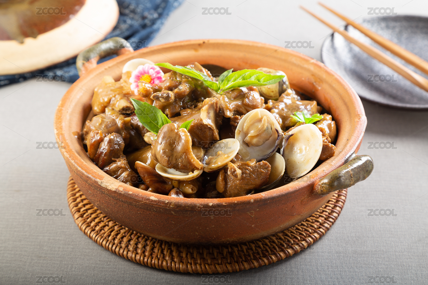 家常菜花甲烧牛蛙盛放在蓝色瓷碗里面