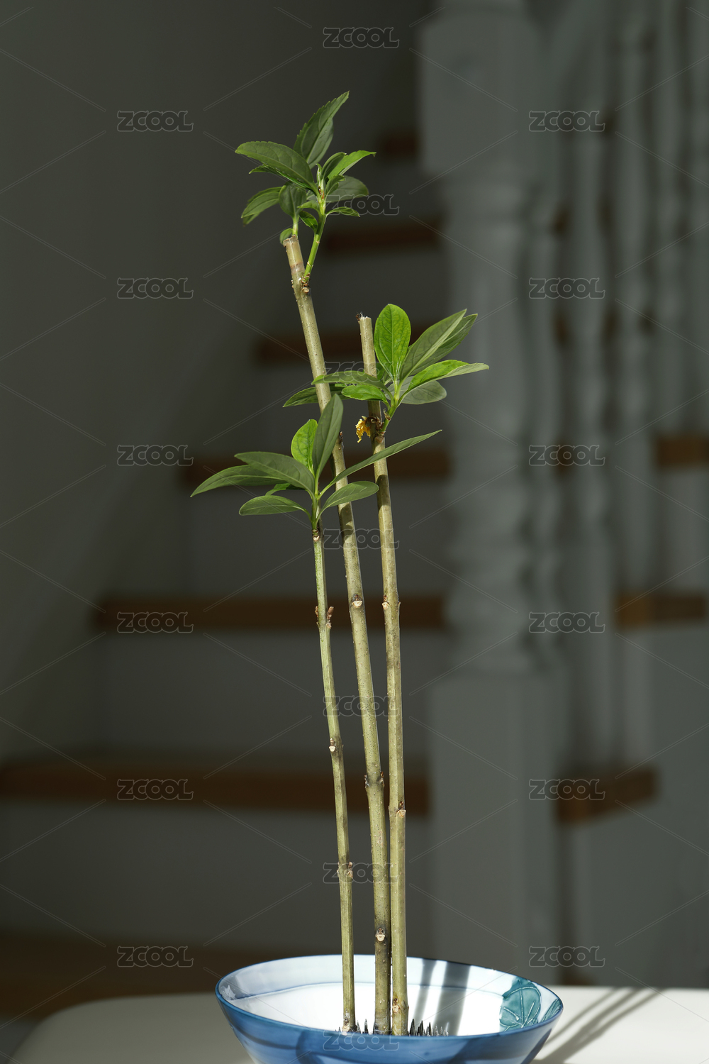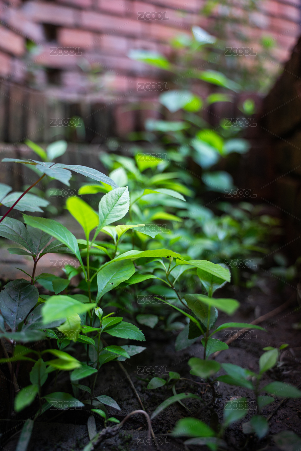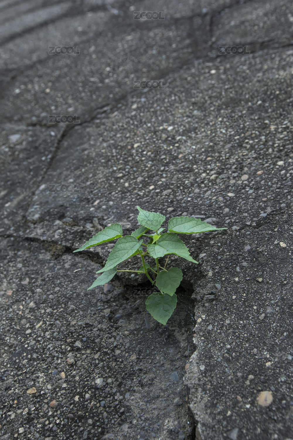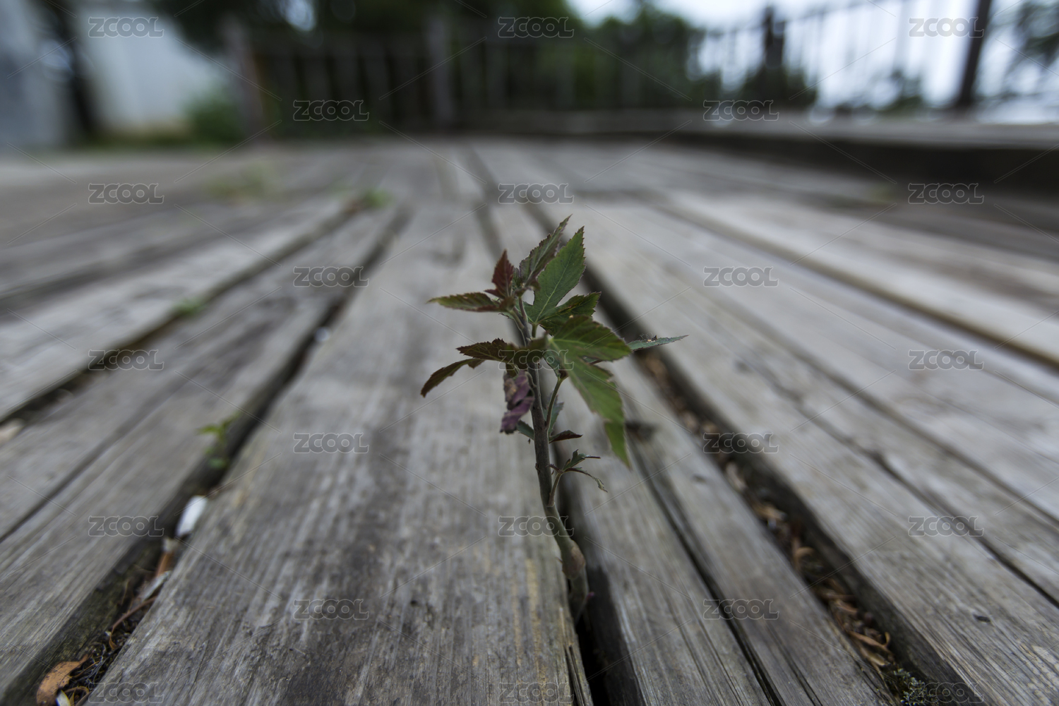 山顶观景台上从腐烂的木板中生长出来的一颗小树苗特写