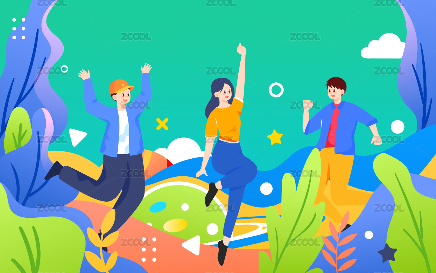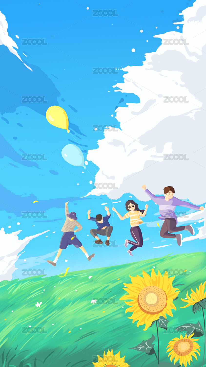 五四青年节青春活泼快乐年轻人跳跃庆祝插画