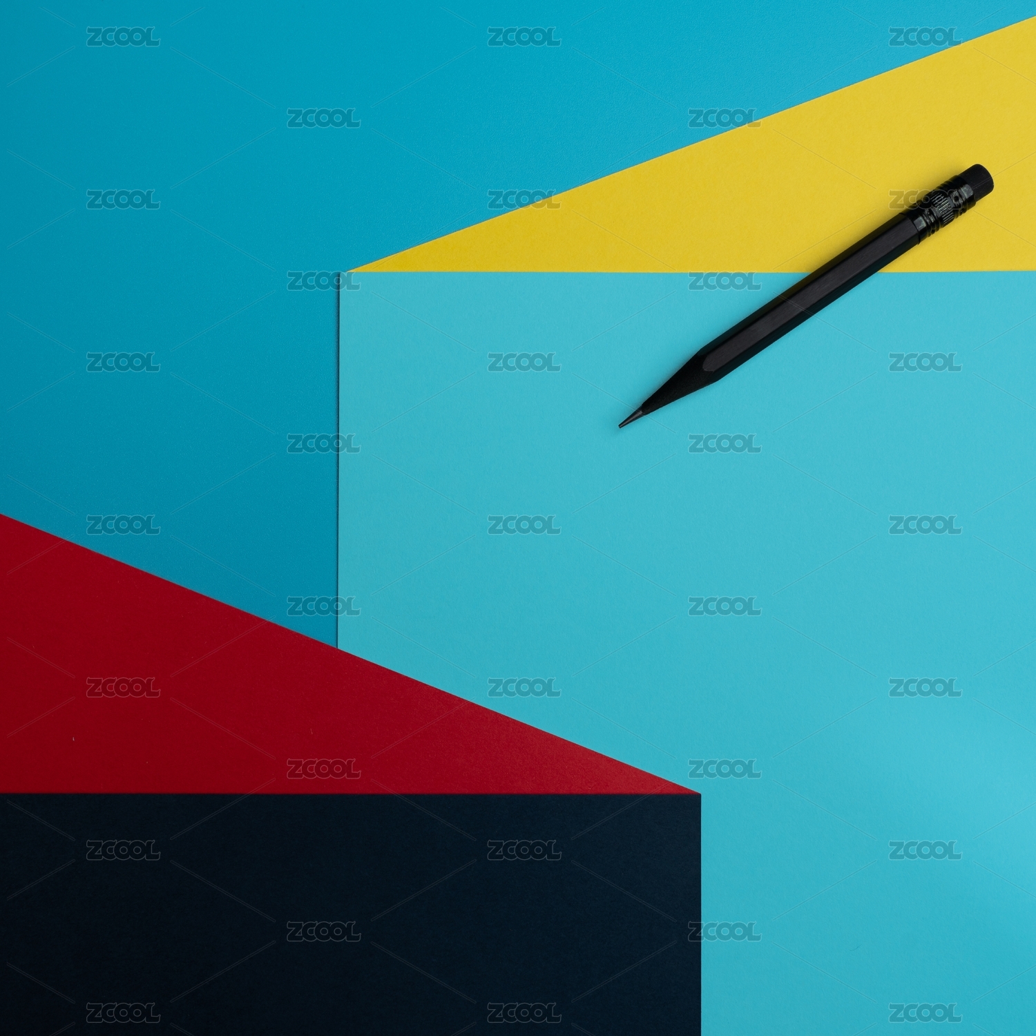 铅笔放在红黄蓝色彩明度形成的伪3D平面中