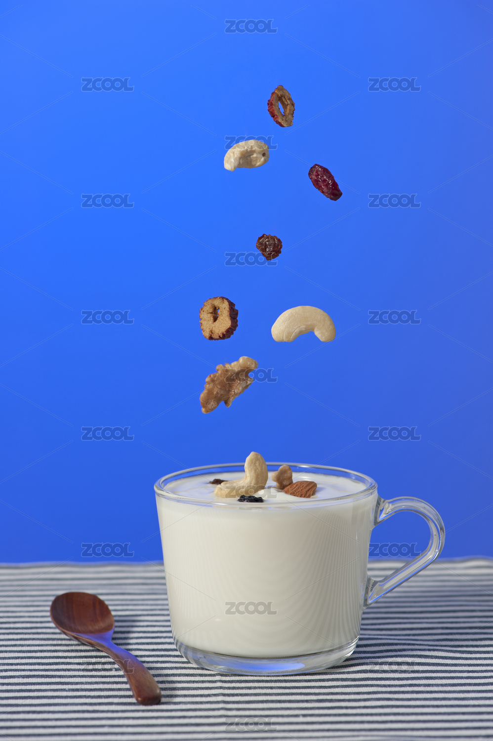 手里拿着的不同角度的酸奶牛奶泡坚果果干