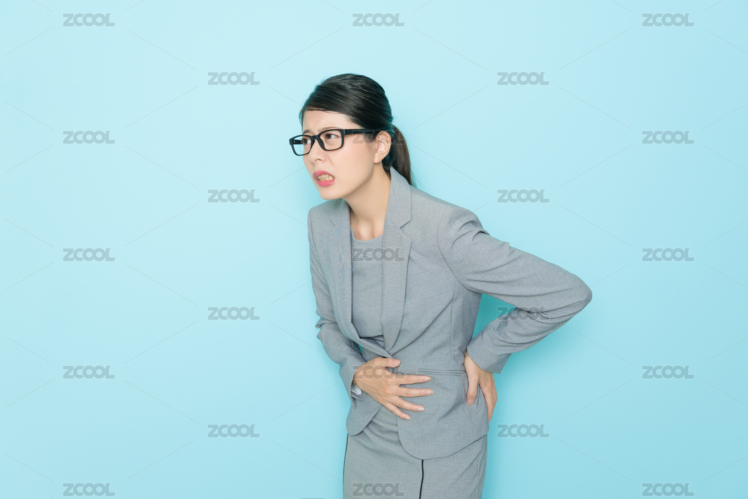 有胃痛病,工作时间长腰越来越痛孤立的蓝色墙壁背景美丽甜蜜的西装妇女。