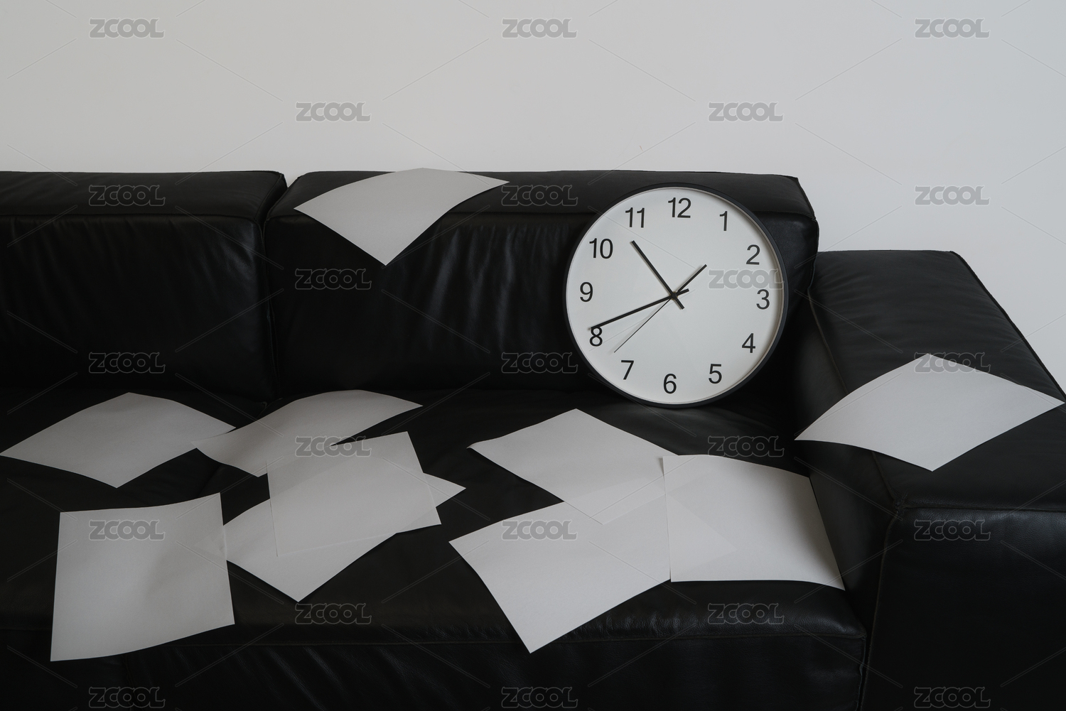 家里黑色沙发上空白的纸和时钟的特写镜头