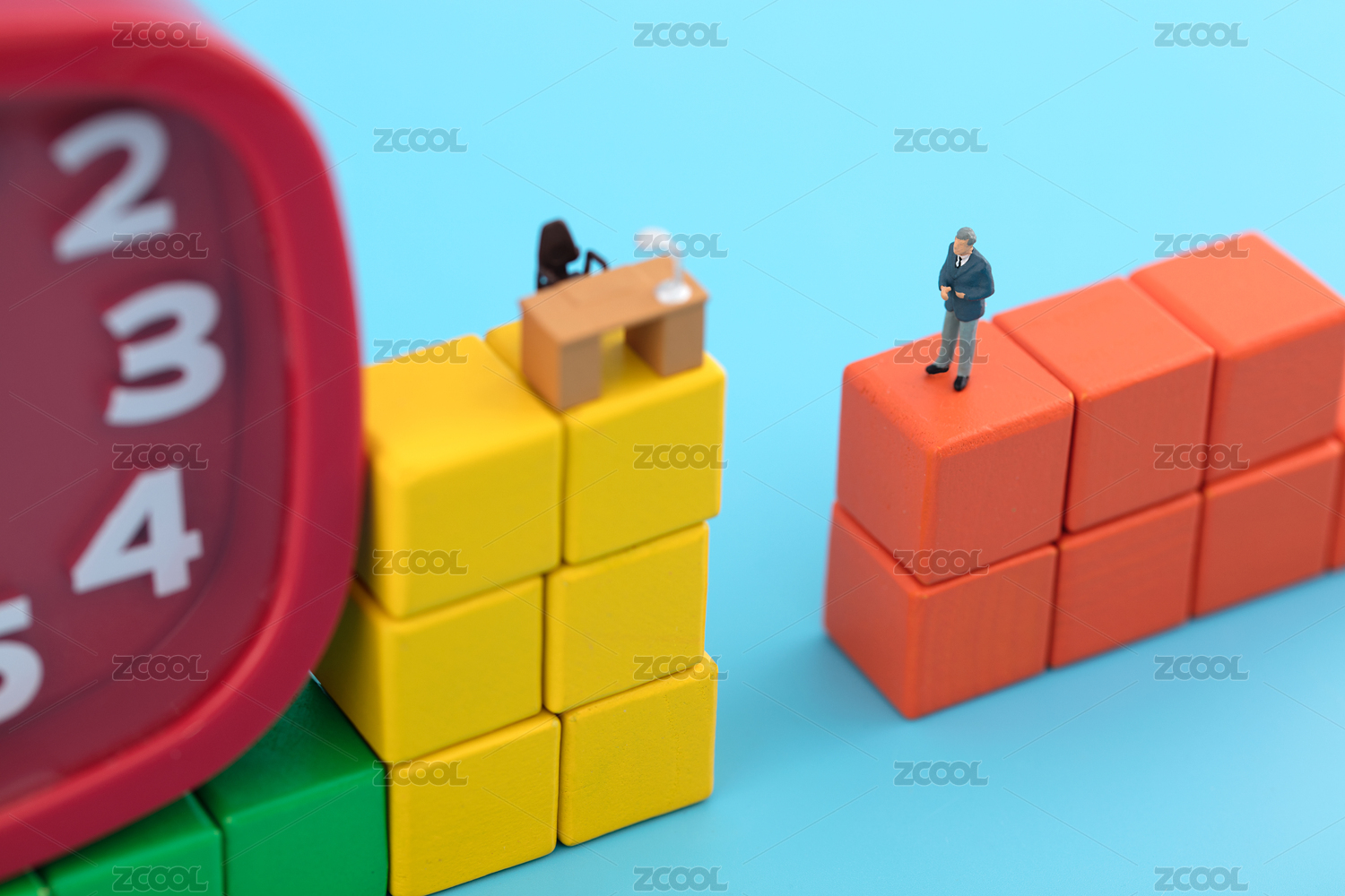 蓝色背景下的时钟和办公桌椅微缩创意图