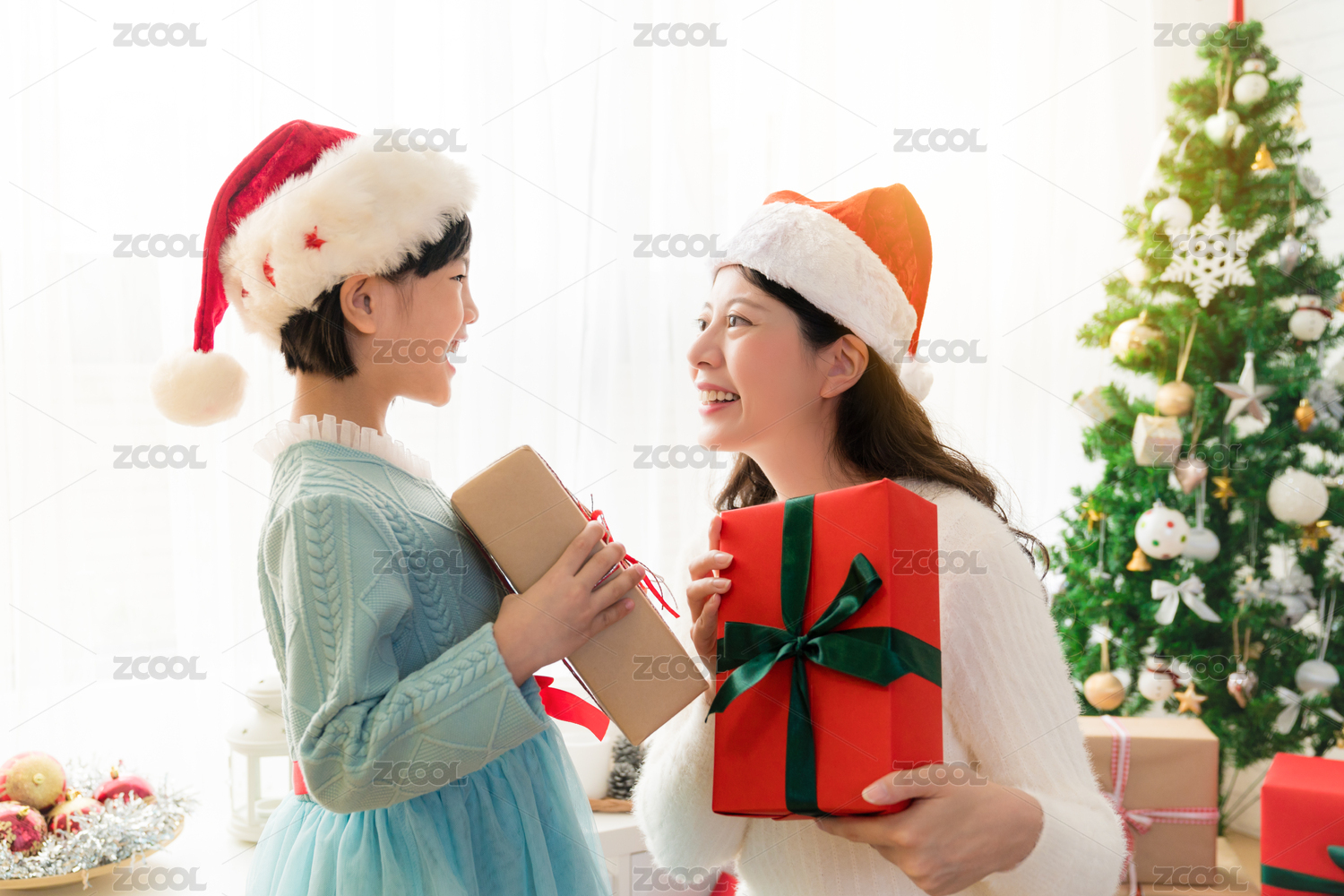 开朗亚洲妈妈和她可爱的女儿的女孩交换礼物,除了窗口。父母很少有孩子的乐趣附近的圣诞树室内。上午圣诞节。肖像家庭收了起来。