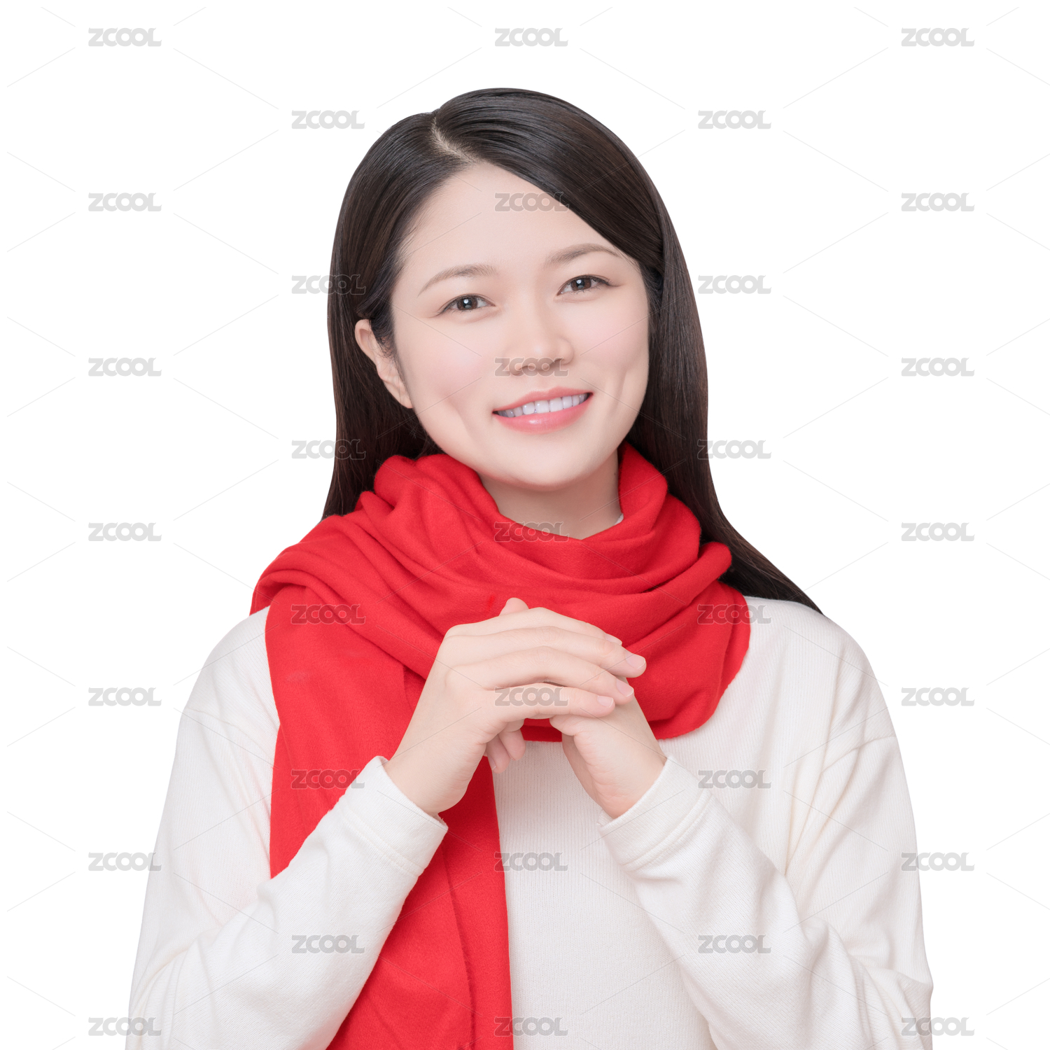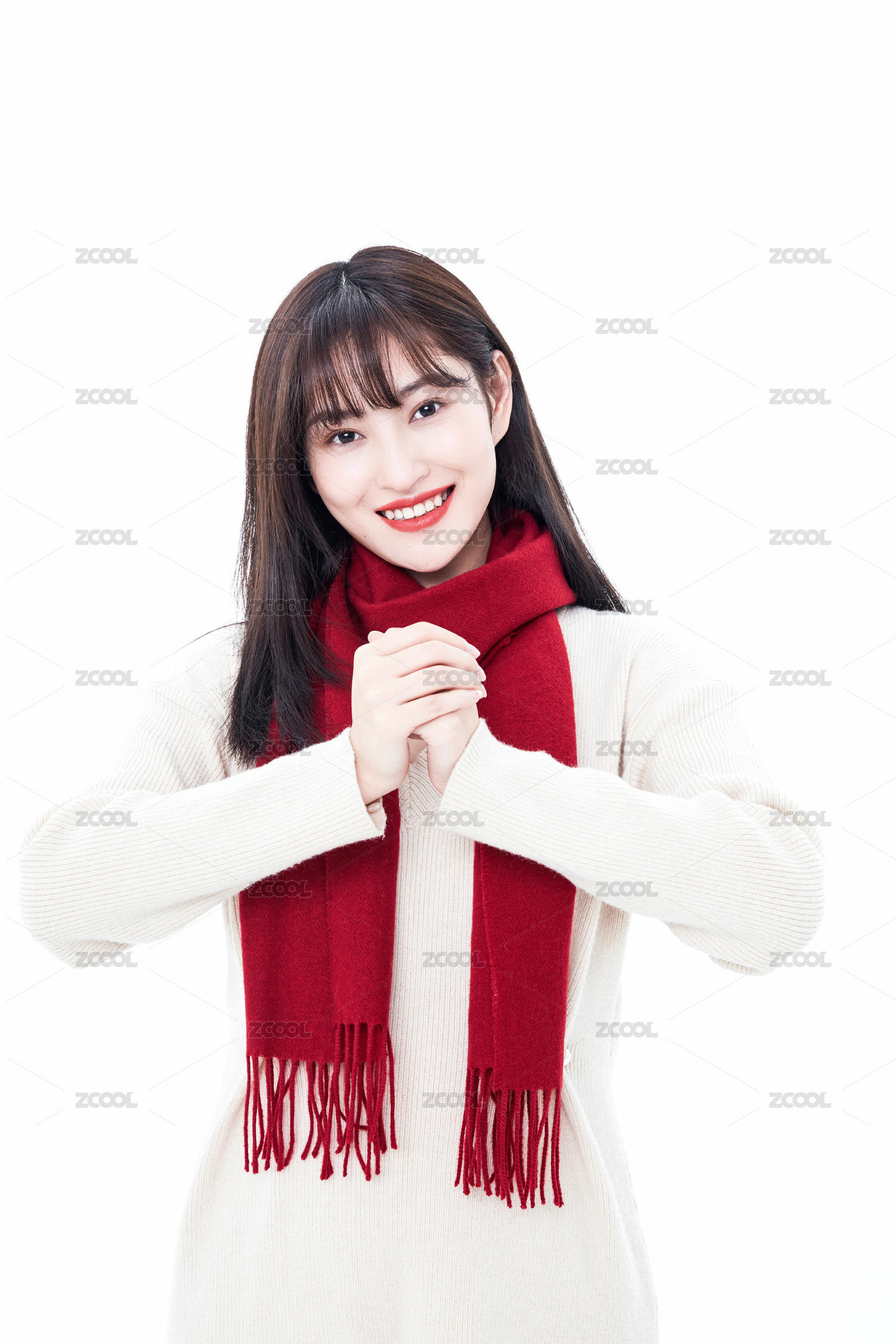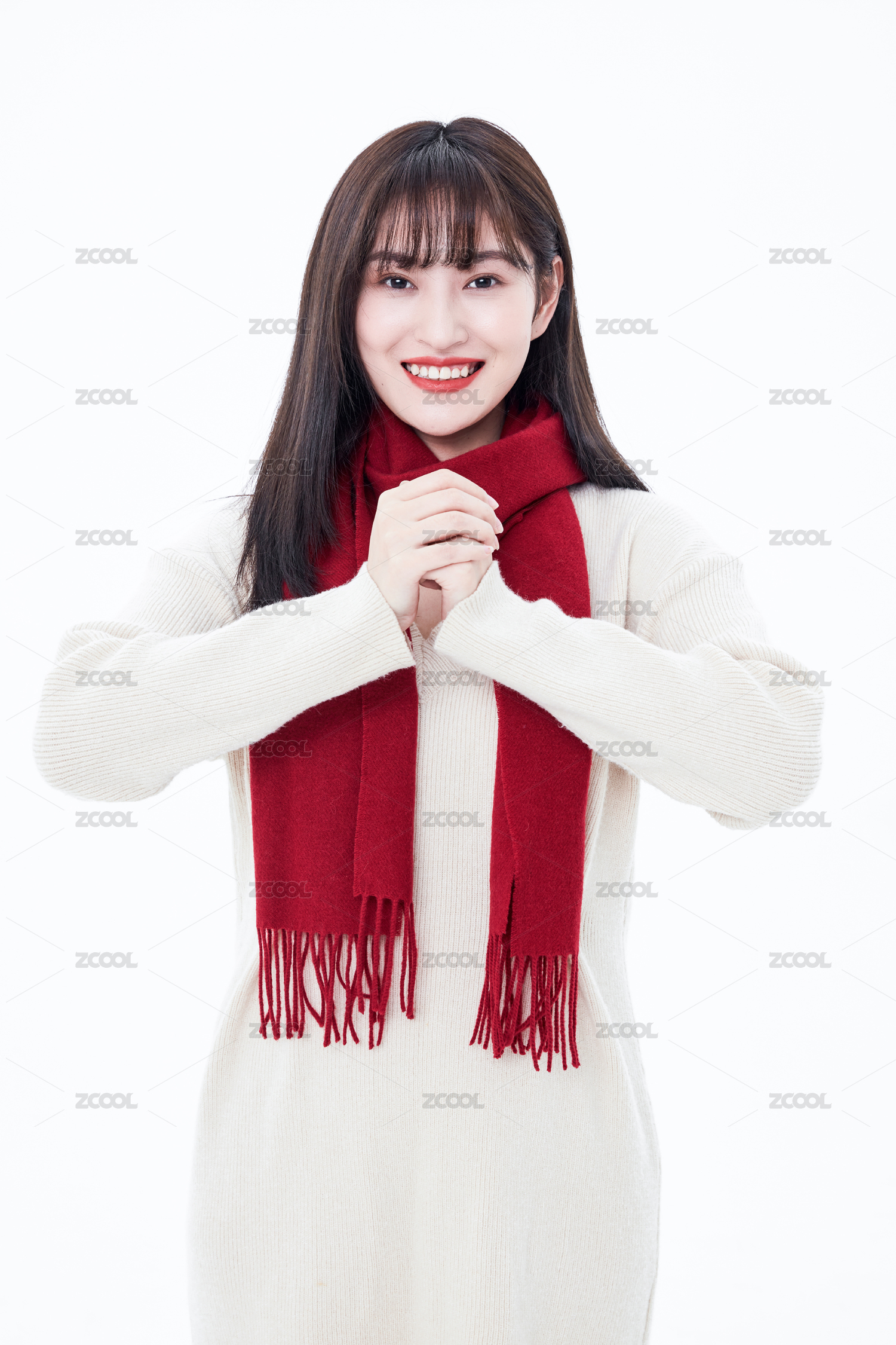 黑色长发的女生开心的微笑着做手势拜年贺喜